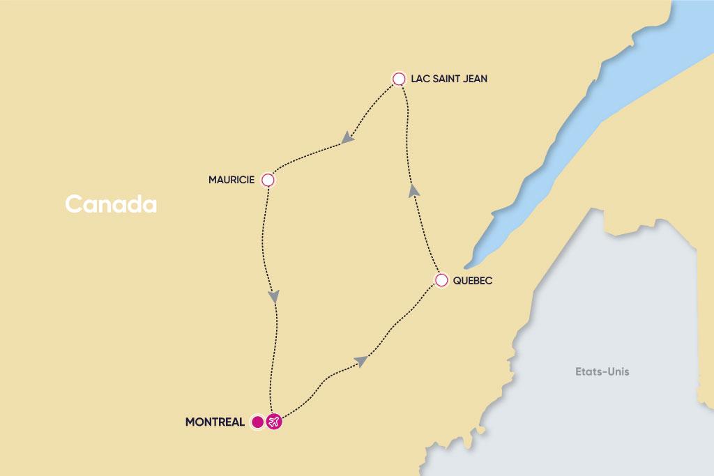Votre autotour au Canada dans la région de Québec en 10 jours / 8 nuits. Il s'agit d'un itinéraire de principe : les étapes pourront être modifiées pour des raisons techniques.