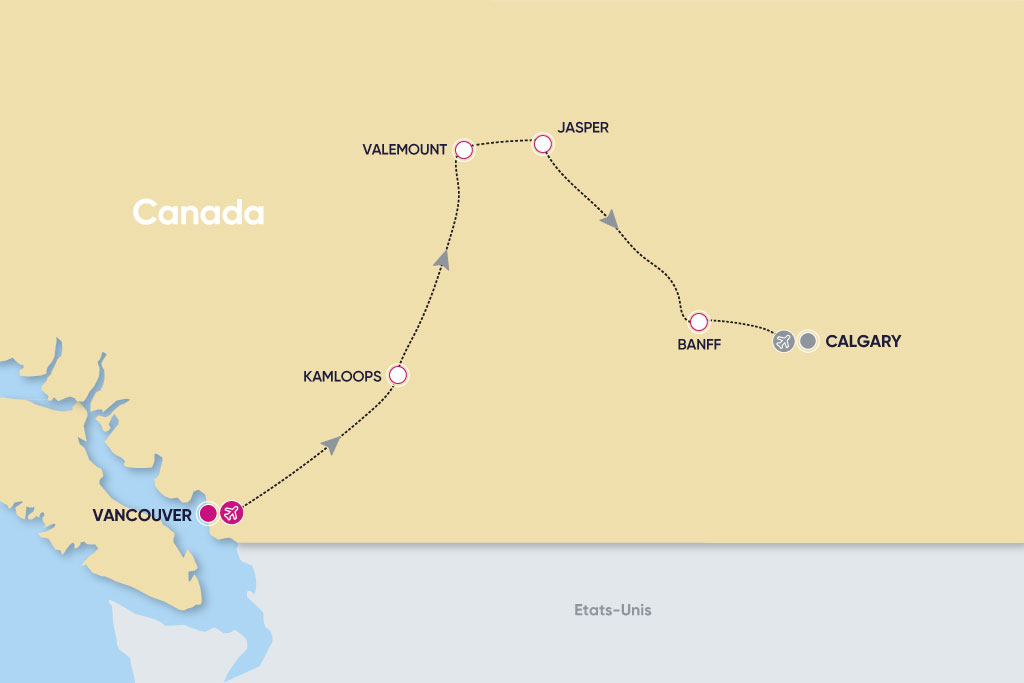Votre autotour dans l'ouest du Canada en 12 jours / 10 nuits. Il s'agit d'un itinéraire de principe : les étapes pourront être modifiées pour des raisons techniques.