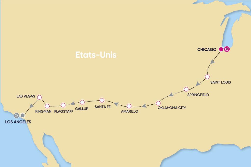 Votre autotour aux États-Unis sur la Route 66 en 17 jours / 15 nuits. Il s'agit d'un itinéraire de principe : les étapes pourront être modifiées pour des raisons techniques.