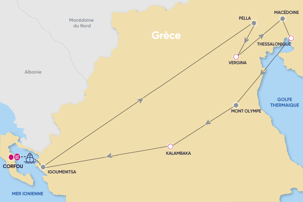 Véritable immersion au cœur de la Grèce continentale et de ses légendes, cet autotour vous invite à parcourir des sites mythiques où se mêlent mythologie, héritage antique et spiritualité byzantine. De la douceur insulaire de Corfou aux cités historiques de Macédoine, des paysages majestueux du Mont Olympe aux monastères suspendus des Météores, chaque étape révèle un visage unique de ce pays fascinant. En toute liberté, découvrez villages traditionnels, vestiges antiques et panoramas spectaculaires, puis laissez-vous porter par l'art de vivre grec : cuisine savoureuse dans les tavernes, hospitalité chaleureuse, rencontres authentiques, … entre histoire millénaire, nature grandiose et culture vivante, cet autotour offre une vision complète et inspirante de la Grèce, idéale pour un voyage riche ne découvertes et en émotions.