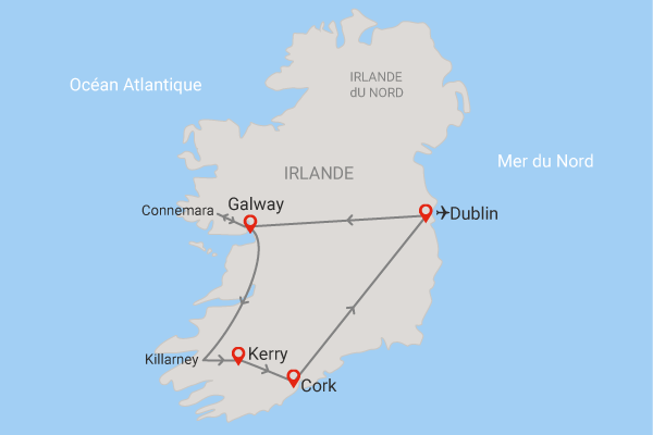 • Itinéraire quotidien suggéré : étapes obligatoires (pouvant être modifiées en fonction de certains impératifs locaux), visites/excursions mentionnées non incluses et optionnelles, sauf la visite des falaises de Moher et l'entrée au château de Blarney qui sont incluses.