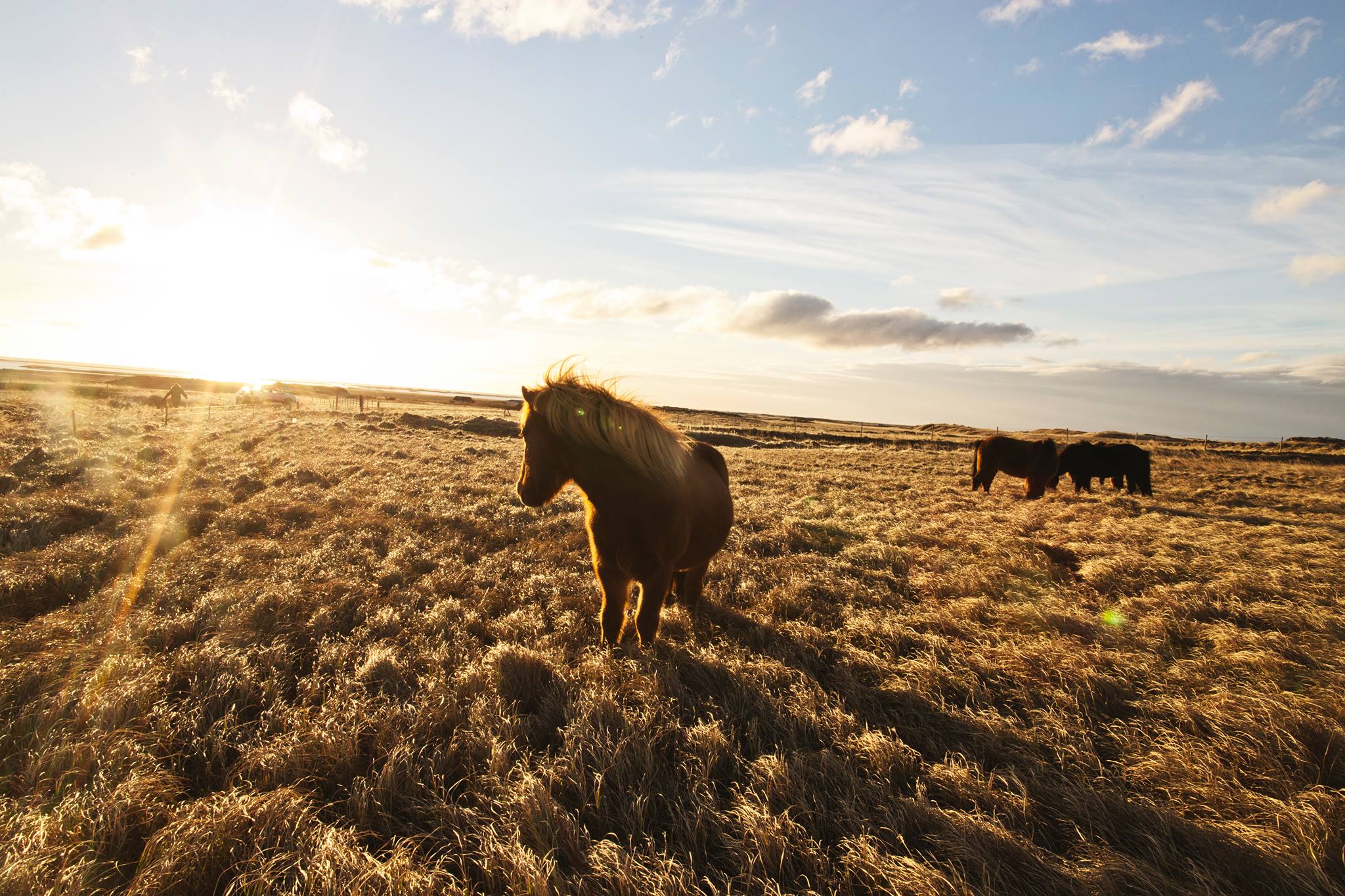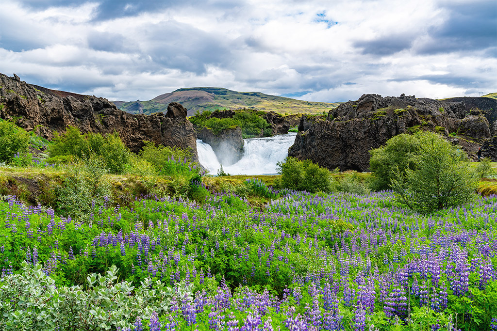 Petit-déjeuner. Découvrez Borgarfjordur : une immense zone de forêts, de grottes et de champs de lave colonisée autrefois par les Vikings. La région compte des chutes d'eau impressionnantes que vous pourrez découvrir. Hraunfossar, la chute de lave, donne l'impression que l'eau glaciaire jaillit à travers des formations de lave. Les chutes de Barnafoss, situées à proximité, ont des eaux d'un bleu éclatant. Visitez Deildartunguhver, se sont les sources d'eau chaude les plus puissantes et les plus rapides d'Europe. Passez par la baie de Hunafloi, un endroit idéal pour observer les phoques. Si vous souhaitez en savoir plus sur les phoques, nous vous suggérons de visiter le centre à Hvammstangi. Traversez des montagnes imposantes et vallées lorsque vous vous dirigerez vers Skagafjordur, une région connue pour l'élevage de chevaux et pour certains bâtiments historiques les mieux conservés d'Islande. Si vous êtes un passionné d'histoire, vous apprécierez Glaumbaer, un écomusée appartenant au patrimoine de Skagafjordur, où vous pourrez vous promener dans un manoir en tourbe datant du XVIIIe siècle. Nuit à l'hôtel Varmahlid.