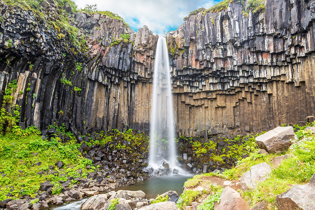 Petit-déjeuner. Prenez la route vers le sud de l'Islande, à la découverte de paysages parmi les plus spectaculaires du pays. Vous longerez le majestueux glacier Vatnajökull et ferez halte sur l'un de ses sites les plus emblématiques : le lagon glaciaire de Jökulsárlón, où dérivent des icebergs scintillants, ainsi que la célèbre Diamond Beach, toute proche. Poursuivez par le parc national de Skaftafell, véritable joyau naturel niché au pied du glacier. Cette région, réputée pour être l'une des plus belles d'Islande, abrite notamment la cascade de Svartifoss, entourée de superbes orgues basaltiques (accessible après une marche). Sur votre itinéraire, ne manquez pas non plus le spectaculaire canyon de Fjaðrárgljúfur, le charmant village de Vík, ainsi que la célèbre plage de sable noir de Reynisfjara, bordée de falaises et de formations rocheuses impressionnantes. Installation à l'Hotel Dyrhólaey 3* ou similaire. Dîner libre et nuit à l'hôtel.