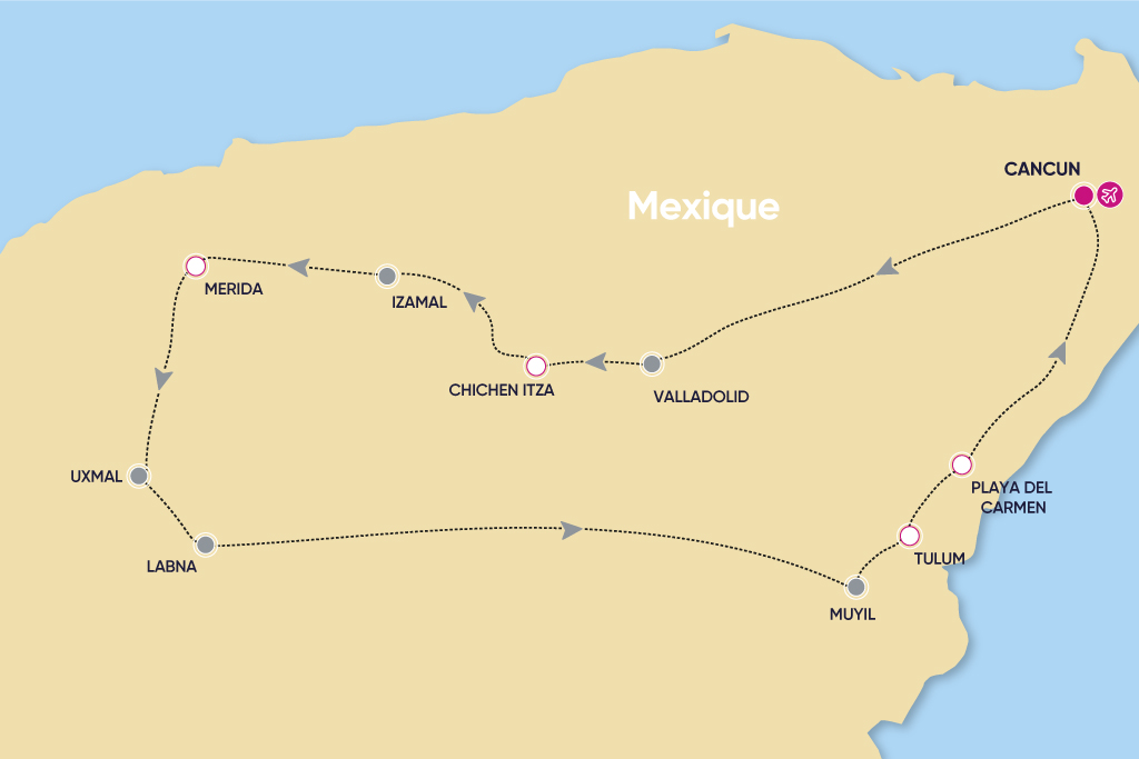 Explorez le Yucatán à travers un autotour alliant harmonieusement héritage maya, nature exubérante et littoral d'exception. Des cités coloniales aux façades pastel aux cénotes translucides nichés dans la jungle, sans oublier les trésors archéologiques de Chichén Itzá, Uxmal ou Tulum, chaque étape révèle un Mexique intense, coloré et profondément ancré dans son histoire. Entre temples majestueux, forêts tropicales, lagunes scintillantes et villages empreints de traditions, le voyage se vit comme une immersion riche en découvertes. Pour clore cette aventure, cap sur Playa del Carmen, perle de la Riviera Maya. Ses plages immaculées baignées par les eaux cristallines des Caraïbes, son ambiance vivante et sa situation idéale pour rejoindre Cozumel ou les réserves naturelles voisines offrent une parenthèse balnéaire parfaite. Une conclusion équilibrée entre farniente, atmosphère caribéenne et douceur tropicale.