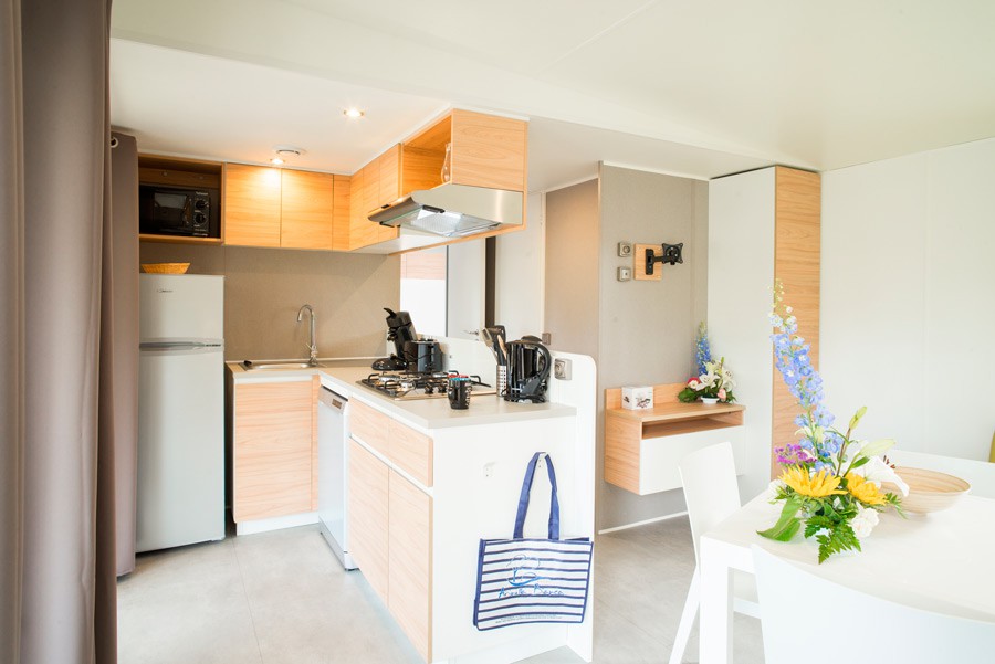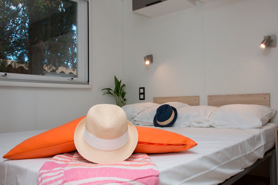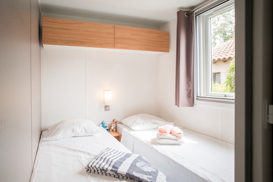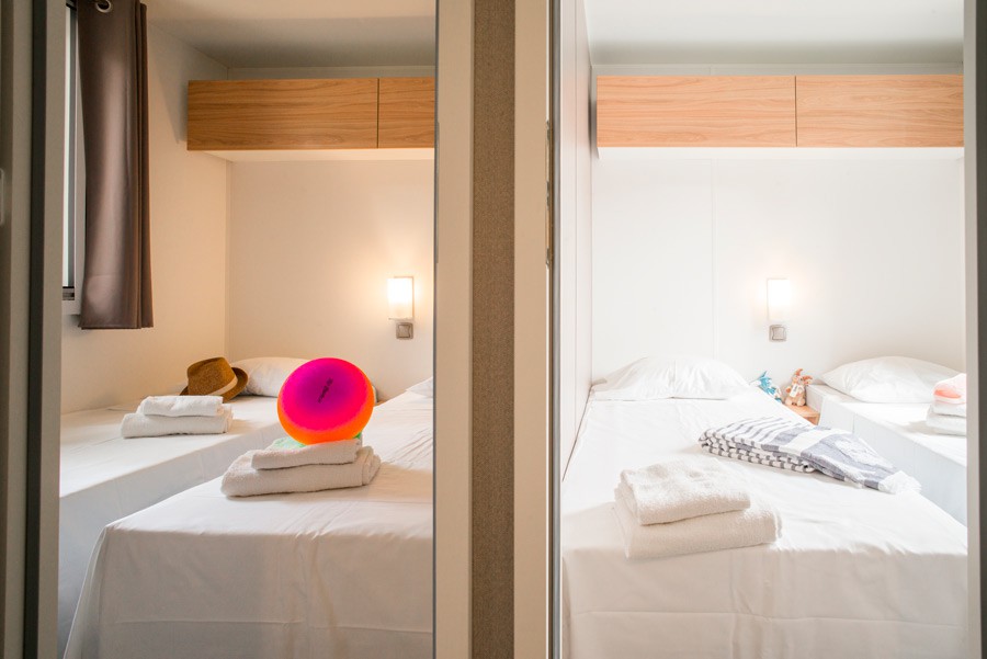 • Mobil-home "Premium" (environ 35 m² - 4 à 6 personnes) : 1 chambre avec un lit double, 2 chambres avec 2 lits simples ou superposés, 1 salle de douche, 1 WC séparé. Important : le linge de maison et le linge de toilette ne sont pas inclus en Mobil-Home Premium.