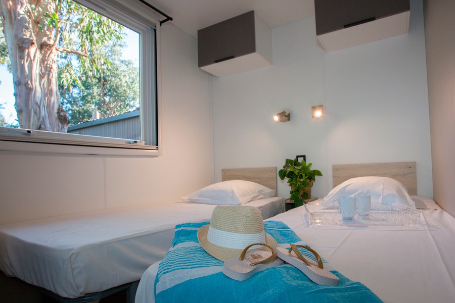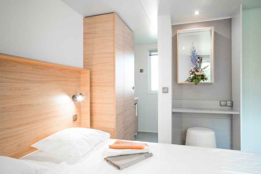 • Mobil-home"Ultimate 4" (environ 33 m² - 4 personnes) : 1 chambre avec un lit double, 1 chambre avec 2 lits jumeaux, 2 salles de douche, 2 WC séparés.