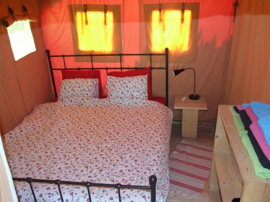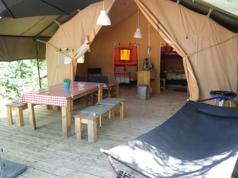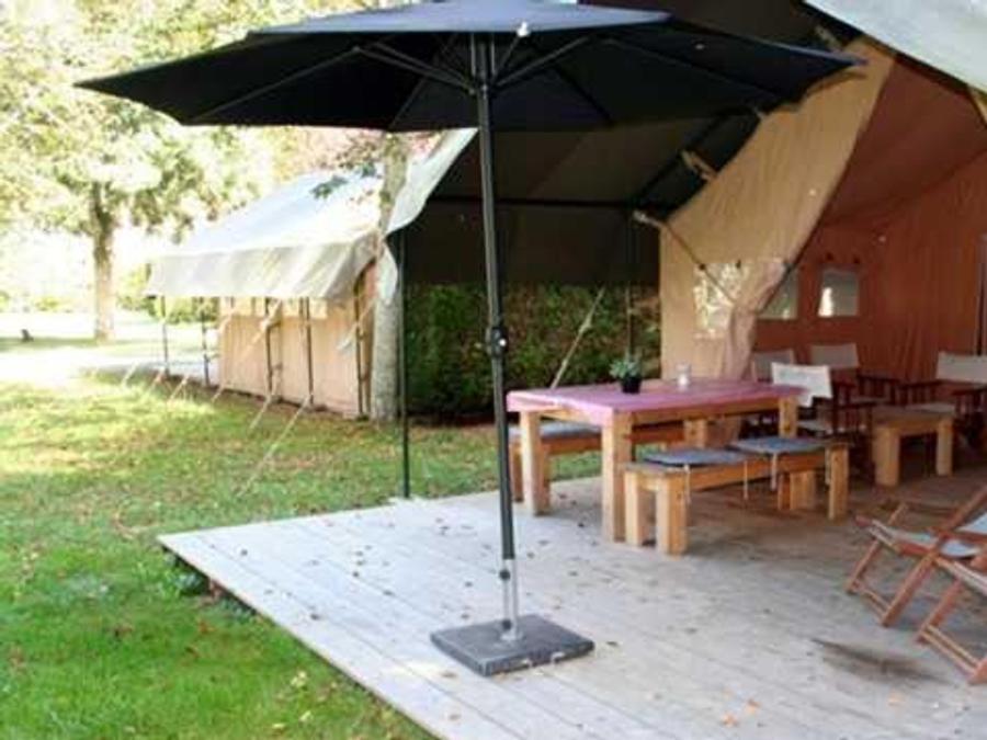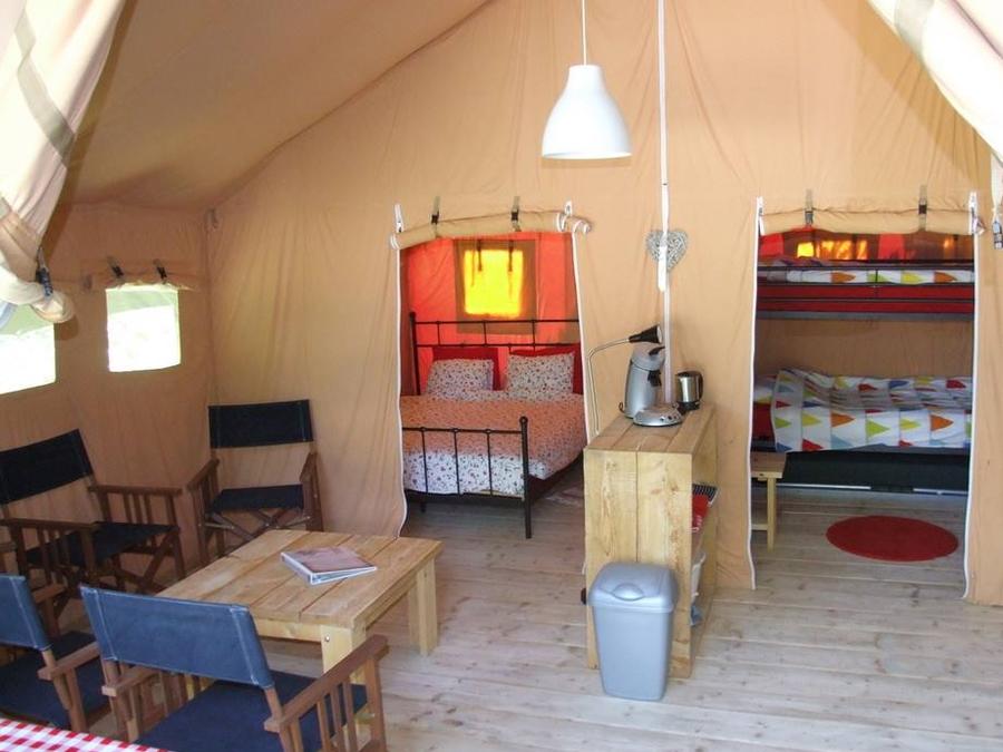 Sur un plancher bois, et avec des meubles tout en bois, vous disposez d'une tente toilée sous laquelle sont réparties :
