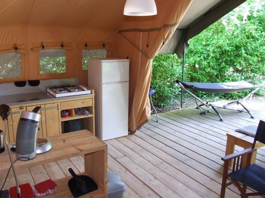 un espace cuisine avec réfrigérateur, plaque de cuisson gaz, cafetière, bouilloire et tous les ustensiles de cuisine et vaisselle pour 2 à 6 personnes (selon la tente choisie).