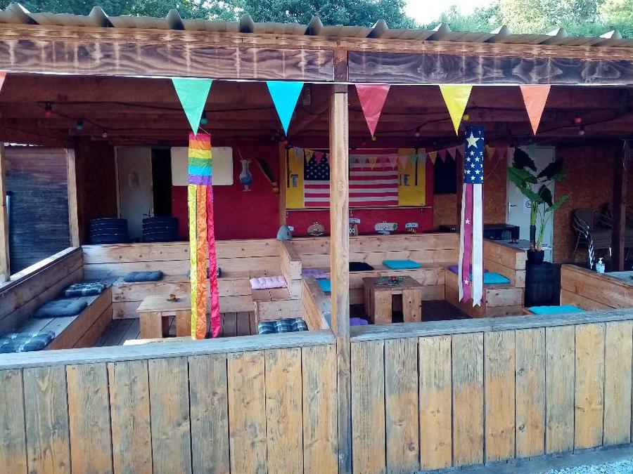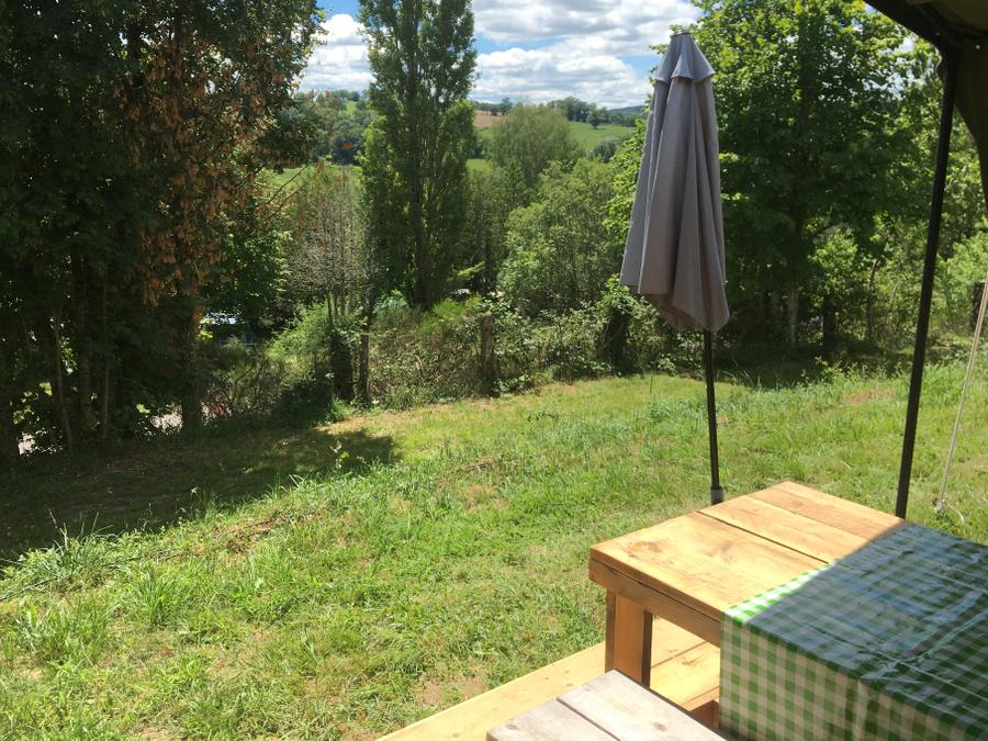 Un grand espace sur terrasse s'offre à vous, où se trouvent une table à manger, des bancs et des transats pour profiter pleinement de la nature de notre camping et de la vue de la Vallée de la Creuse.