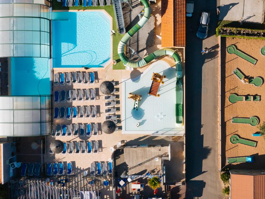 Infos supplémentaires sur l'espace aquatique : L'espace aquatique est ouvert d'avril à septembre de 10 h à 19 h.(selon les conditions météorologiques en basse saison) La grande piscine (dont une partie couverte de 105 m² et une partie extérieure de 90 m²) est chauffée toute la saison pour vous détendre en toute liberté. À l'extérieur, le toboggan tout neuf et la pataugeoire de 25 m² promettent glissades, éclaboussures et fous rires aux plus jeunes, en toute sécurité. Le short de bain est interdit. Maillot ou boxer de bain obligatoire. Le port du bracelet est obligatoire. Baignade surveillée en juillet/août uniquement. Les horaires mentionnés sont à titre indicatif et sous réserve de modifications. L'accès aux espaces aquatiques peut être soumis à restrictions, selon les conditions climatiques et sanitaires, et d'éventuels travaux de maintenance en vigueur lors de votre séjour.