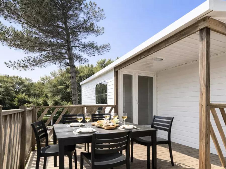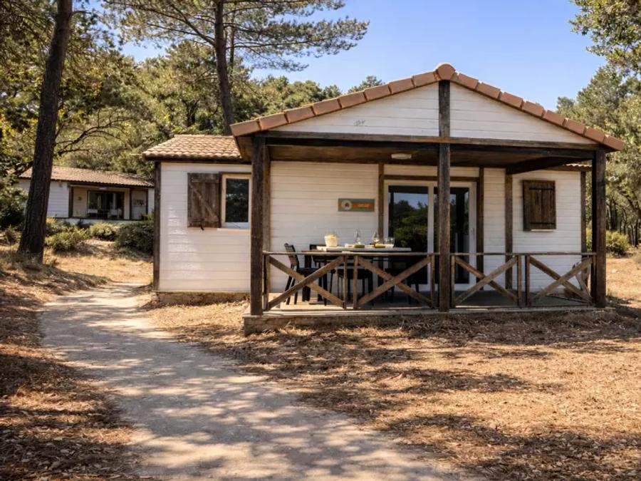 Chalet spacieux avec terrasse privative, cuisine équipée (machine à café, grille-pain, bouilloire, ustensiles), salon ouvert, 1 chambre avec lit double (140x200), 1 chambre avec 2 lits simples (80x190), 1 chambre avec lits superposés (2x 80x190), salle de bain, toilettes séparées.