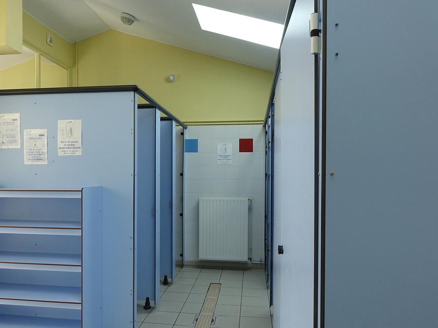 Cabine de douche, vasque, rangements, sèche-cheveux