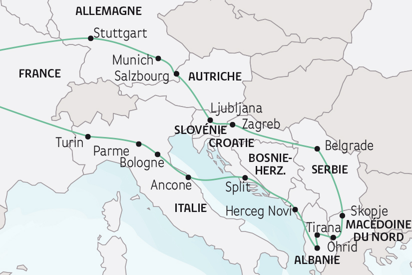 Salzbourg, Ljubljana, Zagreb, Belgrade, Skopje, Tirana, les Bouches de Kotor, Dubrovnik, Mostar, Split