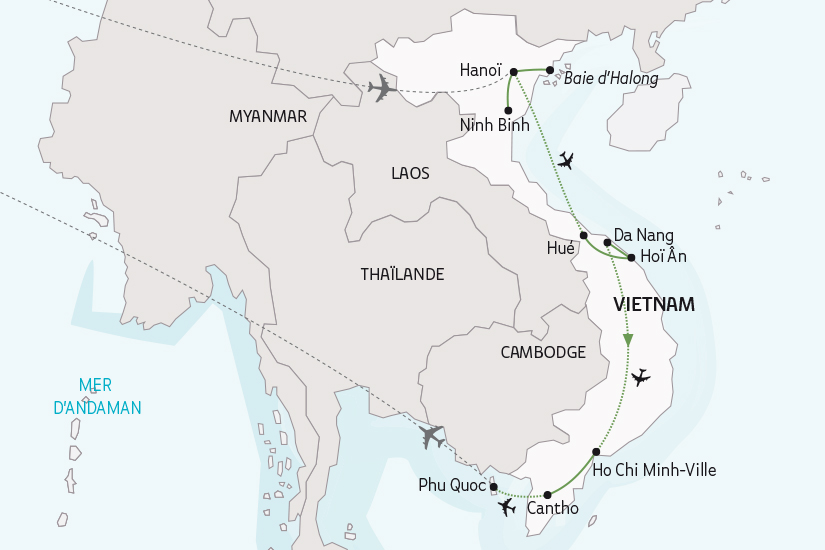 • Sur-la les compagnie Vietnam Airlines ou Viet Jet , pour les vols Hanoï/Hué, Danang/Ho Chi Minh Ville et Can Tho/Phu Quoc