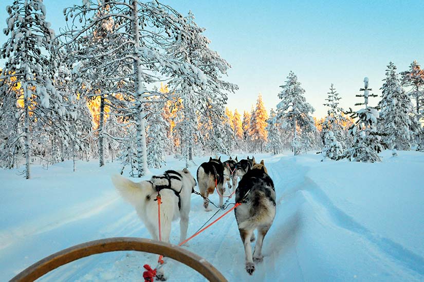 Départ pour la ferme des huskies. Le musher vous fera découvrir sa passion : l'élevage et le mode de vie de ses chiens. Départ pour une promenade d'environ 5 kilomètres à travers les étendues enneigées de Laponie. Glissez sur la neige vierge, loin des stations touristiques et goûtez à la magie des grands espaces enneigés. Vous serez à deux par traîneau : l'un sera passager et l'autre « musher » (conducteur) – vous pourrez alterner pendant le safari. Les enfants ne peuvent en aucun cas être « musher ». Déjeuner. Dîner logement.