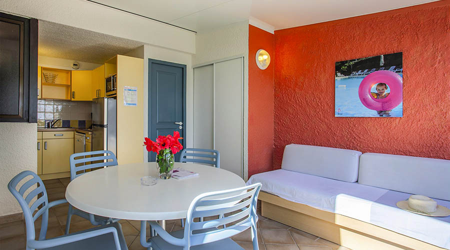 Tous les hébergements sont équipés d'une salle de bains avec douche et WC, d'une télévision, d'un coffre-fort, ainsi que d'un aspirateur. En option locative, la kitchenette est accessible et est fournie avec plaques de cuisson, micro-ondes, lave-vaisselle, grille-pain, réfrigérateur-congélateur et cafetière électrique. Le linge de lit est fourni en location ; en demi-pension, les lits sont faits à l'arrivée, le linge de toilette est fourni et le ménage final est inclus. Un kit bébé est disponible gratuitement sur réservation — le forfait bébé est en revanche obligatoire en demi-pension. Enfin, le club propose des services supplémentaires : une connexion Wifi gratuite à la réception et au bar, laverie avec table et fer à repasser, et un parking pour les résidents.