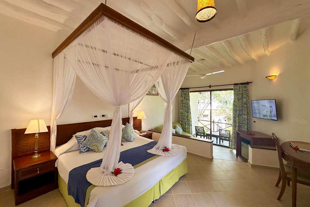 La Chambre Pwani dispose des mêmes équipements que la Chambre Baobab avec canapé-lit, ventilateur de plafond
