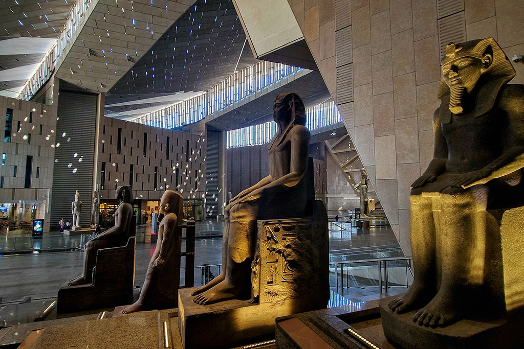 Petit-déjeuner à bord. Transfert à l'aéroport et envol pour Le Caire. À l'arrivée, accueil par notre représentant. Départ pour la visite du Grand Musée Egyptien ouvert en novembre 2025. Le musée est une véritable caverne d'Ali Baba regroupant plus de 100 000 objets : sarcophages, statues, sphinx, mobiliers, arts décoratifs, momies, collections de bijoux, ainsi que le célèbre trésor de Toutankhamon. Déjeuner en ville. L'après-midi, visite du Caire islamique, la Citadelle de Saladin, la Mosquée de Mohamed Ali. Le Caire, "Ville aux mille minarets", compte des centaines de mosquées de différentes époques. La Citadelle, bâtie par Saladin à la fin du XIIe siècle, devint la résidence des souverains Ayyubides, puis Mamelouks. Mohamed Ali fit construire, en son enceinte, la mosquée qui renferme son tombeau, dans le style de Sainte-Sophie d'Istanbul. À l'intérieur, l'énorme lustre, les dorures, les tapis, les panneaux d'albâtre dont la mosquée est entièrement recouverts, composent un décor somptueux. Temps libre pour le shopping dans le souk de Khan El Khalili. Dîner et nuit à l'hôtel. En option, « Son & Lumière » en français aux pyramides de Guizèh (60€ par personne, à réserver et à régler sur place.