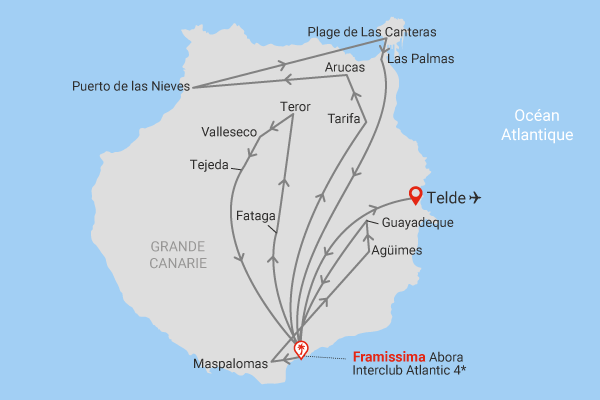 Découverte de l'intérieur de l'ile, en traversant au sud des ravins semi-désertiques avec la Vallée de Fataga et au nord des paysages luxuriants. Vous découvrirez également les bienfaits de l'Aloe Vera lors de la visite d'une plantation. Profitez de différents arrêts pour découvrir des villages pittoresques comme Teror et la richesse de son patrimoine religieux. Déjeuner à Valleseco. Enfin, vous visiterez,Tejada, reconnu pour être l'un des plus beaux villages d'Espagne. Retour au FRAMISSIMA ABORA INTERCLUB ATLANTIC BY LOPESAN 4* en fin de journée. Dîner à l'hôtel.