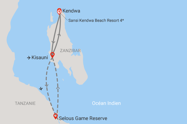 Transfert à l'aéroport de Selous et décollage matinal (6h). Vol retour d'environ 50 minutes* vers Zanzibar. Retour à l'hôtel Sunseabar Beach Hotel Kendwa 4*. Dîner et soirée.