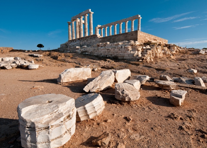 L'après-midi, la côte d'Apollon et du cap Sounion. La route d'Apollon longe la côte sur le pourtour du golfe de Saronique et mène au cap Sounion. Sentinelle avancée de l'Attique, Akri Sounio, le "promontoire sacré" d'Homère, occupe un site marin remarquable face à la mer Egée et aux Cyclades. Vous découvrirez les vestiges du temple, datant du Vème siècle avant J.-C. et dédié au dieu de la mer, Poséidon, que les marins invoquaient lorsqu'ils doublaient le cap.