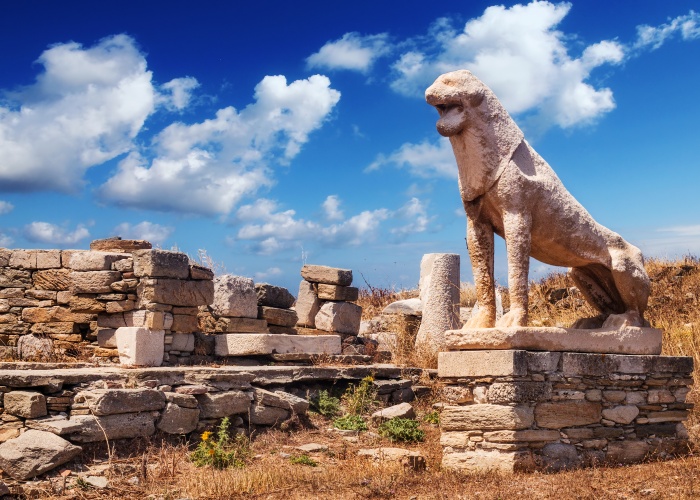 Le matin, Delos (débarquement/embarquement en chaloupes). Cette île battue par les vents était le sanctuaire d'Apollon. Pour les anciens, elle était comme le centre de l'archipel, autour duquel les autres îles gravitaient. Delos joua un rôle religieux et commercial considérable dans l'Antiquité : on y venait de tout le monde grec. Outre le sanctuaire d'Apollon, vous admirerez la terrasse des Lions et le quartier du théâtre aux maisons décorées de superbes mosaïques. Retour à bord et navigation vers Mykonos.