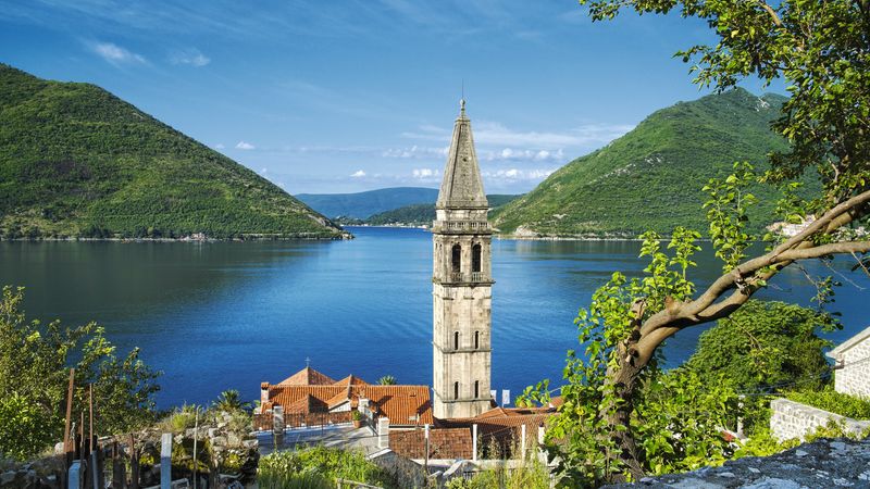 Après-midi en navigation dans les bouches de Kotor. La mer y pénètre sur plusieurs kilomètres, formant de multiples baies aux eaux calmes que sillonnait autrefois une marine puissante qui faisait la richesse de quelques ports. L'abondance des pluies et la douceur du climat, dans cette baie en forme de fjord, expliquent la luxuriance de la végétation.