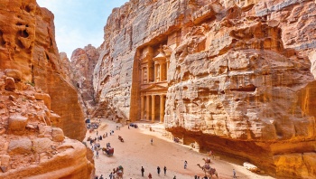 Journée d'excursion optionnelle à Pétra (déjeuner inclus - temps de route 2h aller et 2h retour). Pétra est sans conteste l'une des plus grandes merveilles jamais érigées par l'Homme et la Nature et le plus précieux fleuron de Jordanie. Capitale taillée dans la pierre rose et rouge par les Nabatéens, peuple arabe établi en Jordanie voici plus de 2000 ans, Pétra, « roche » en Grec, était stratégiquement située à la jonction des routes du commerce de la soie et des épices. Pour pénétrer dans la cité on emprunte le "siq", une étroite gorge d'un kilomètre, délimitée par d'abruptes falaises et qui débouche sur Al Khazneh, le "Trésor" : Tombeau d'un nabatéen, cette imposante façade hellénistique a été taillée à même la roche rose au début du Ier siècle, c'est un chef d'œuvre de raffinement et de symétrie qui justifie à lui seul une visite à Pétra. Vous découvrirez également le théâtre nabatéen de style romain taillé dans la roche il y a plus de 2000 ans.
