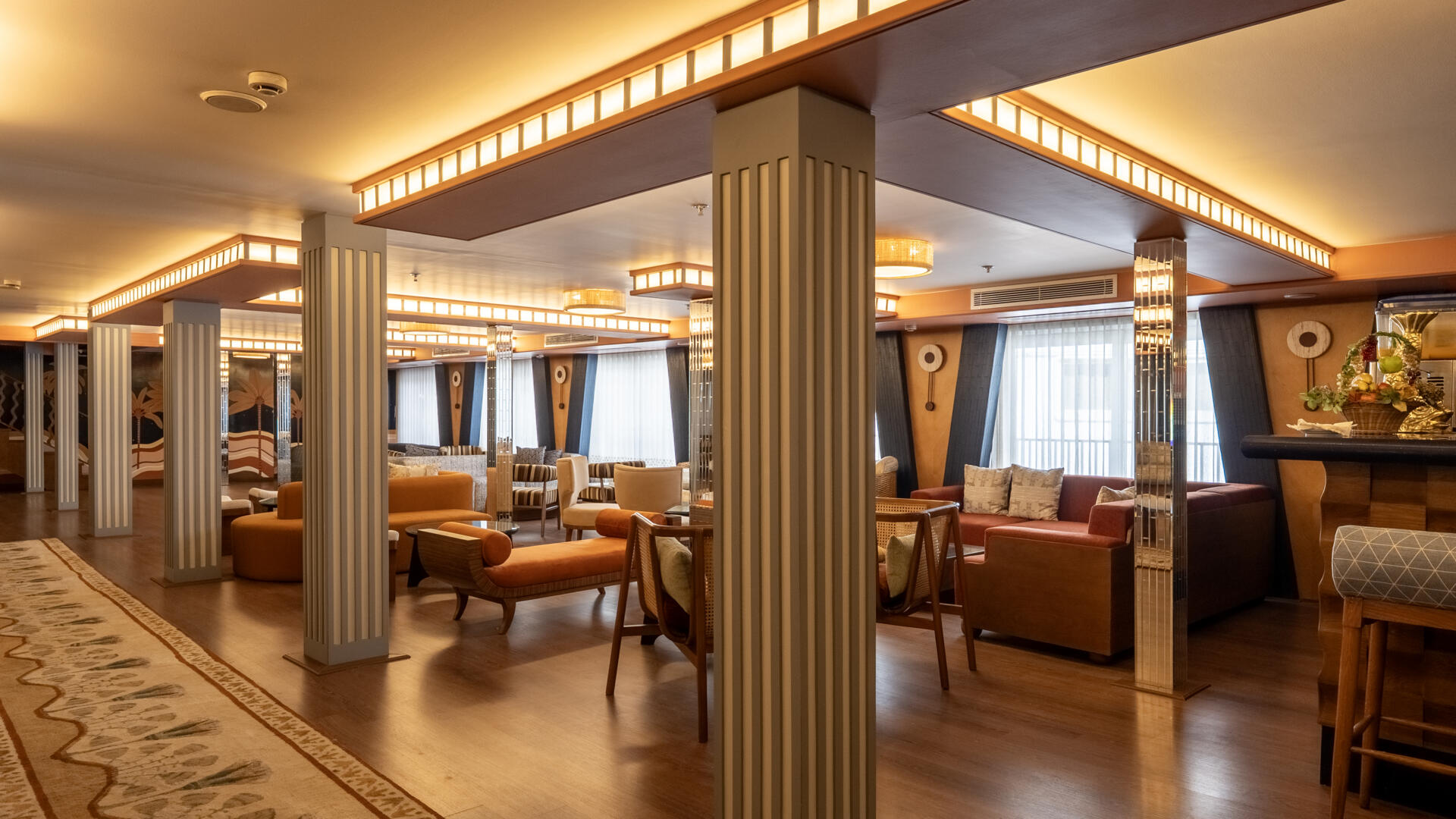 Pont supérieur aménagé : piscine, chaises longues, solarium avec chaises longues, espace avec terrasse pour prendre un verre. A l'intérieur, agréable salon avec bar et piste de danse. Activités ludiques.