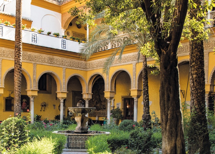 Le matin, excursion incluse : visite guidée du palais de las Dueñas. Situé dans le quartier de Féria, le palais a été construit entre le XVe et XVIe siècle et réunit les styles mudéjar, gothique et Renaissance. Il comprend plusieurs bâtiments, des patios et des jardins. Vous découvrirez les écuries, le patio des citronniers qui a vu naître le grand poète Antonio Machado, le patio principal avec de nombreuses œuvres d'art et éléments décoratifs, puis le salon de la gitane, centre de la vie sociale de cette maison, ornée d'une sculpture de Mariano Benlliure. Plusieurs salles illustrent les piliers de la culture andalouse : la tauromachie, la religion et le flamenco.