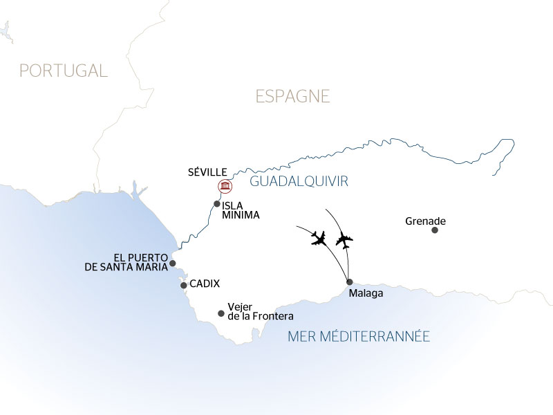 Le matin, visite guidée incluse : Séville à pied. Découvrez cette splendide ville et son riche passé arabe. La capitale andalouse abrite un trésor inestimable de monuments inscrits au patrimoine mondial de l'UNESCO. En début d'après-midi, départ en navigation vers Cadix. Vous longerez le parc de Doñana classé par l'UNESCO "réserve naturelle de la Biosphère". Il s'étend sur la rive droite du Guadalquivir jusqu'à son estuaire. Situé entre l'Europe et l'Afrique, il constitue la plus importante zone humide d'Europe et attire plusieurs millions d'oiseaux migrateurs.