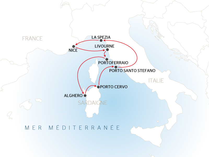 Au cœur de la Toscane, le génie italien s'est manifesté avec éclat du XIIe au XVIe siècle et sera à l'origine de la Renaissance, mouvement qui va traverser l'Europe entière. Florence, véritable ville-musée, ou encore Lucques abritent au cœur de leurs places et ruelles des palais et églises de toute beauté et ont su préserver charme et authenticité. À travers la campagne toscane, oliviers, vignes et cyprès composent un paysage lumineux qui vous séduira. Sur l'île d'Elbe, vous découvrirez Portoferraio, port avec ses maisons de calcaire rose. Puis cap vers l'archipel de la Maddalena en Sardaigne ; navigation entre rochers de granit et plages secrètes aux eaux turquoise à travers la Costa Smeralda qui vous offre un paysage de baies entrecoupées de côtes accidentées. Enfin halte inoubliable aux Cinque Terre dont les villages de pêcheurs aux maisons colorées suspendues dominent la grande bleue.