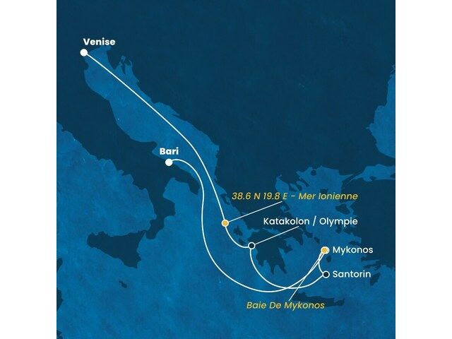 L'horaire est indicatif et pourrait varier. En cas de conditions météorologiques défavorables, l'expérience pourrait subir des variations ou être suspendue. Une fois à bord, nous vous conseillons de consulter notre Costa App pour vous tenir toujours au courant.