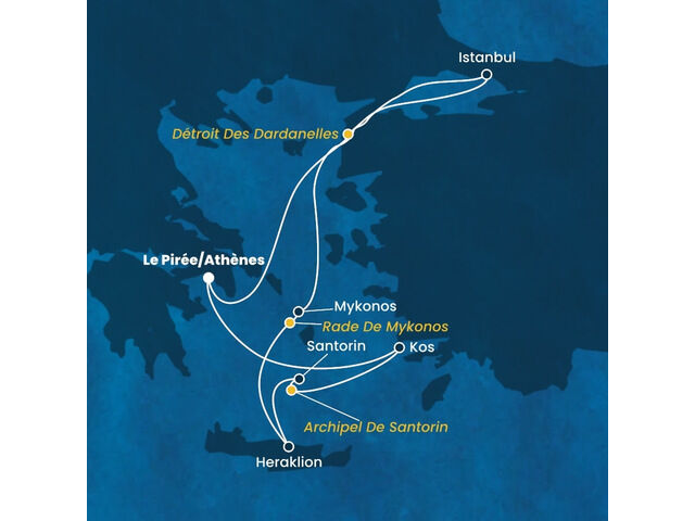 À votre arrivée dans le port de Santorin, vous serez enthousiasmés par le charme de la baie de cette magnifique île grecque volcanique. L'harmonie entre les eaux turquoise et le blanc des villages situés en haut des falaises est une expérience véritablement exceptionnelle.