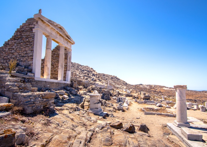 Le matin, excursion incluse : Delos, l'île sacrée d'Apollon (débarquement/embarquement en chaloupes). Cette île battue par les vents était le sanctuaire d'Apollon. Pour les anciens, elle était comme le centre de l'archipel, autour duquel les autres îles gravitaient. Delos joua un rôle religieux et commercial considérable dans l'Antiquité : on y venait de tout le monde grec. Outre le sanctuaire d'Apollon, vous admirerez la terrasse des Lions et le quartier du théâtre aux maisons décorées de superbes mosaïques. Retour à bord en chaloupes et navigation vers Mykonos.
