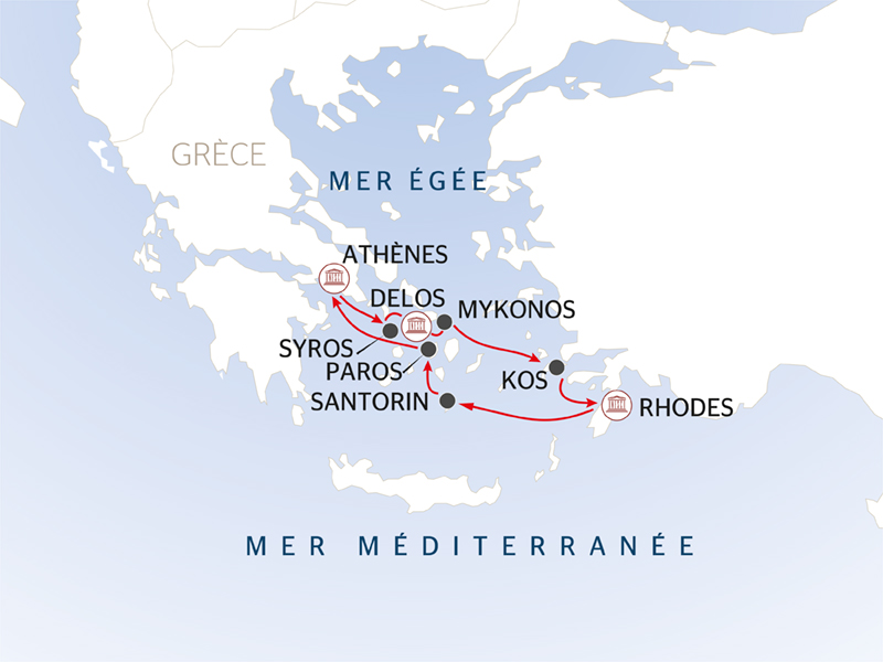 Matinée en navigation sur la mer Égée au coeur de l'archipel des Cyclades dont les îles allient la beauté de leurs côtes escarpées au charme de leurs villages perchés à flancs de montagne et étincelants de blancheur et leurs plages aux eaux d'un bleu infini.