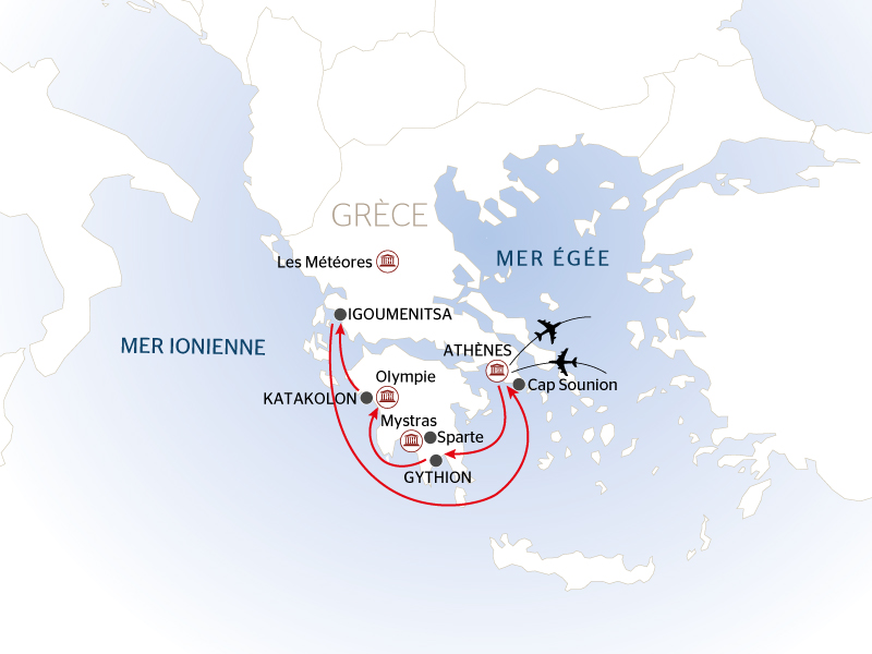 L'après-midi, excursion incluse : la côte d'Apollon et le cap Sounion. La route d'Apollon longe la côte sur le pourtour du golfe Saronique et mène au cap Sounion. Sentinelle avancée de l'Attique, Akri Sounio, le "promontoire sacré" d'Homère, occupe un site marin remarquable face à la mer Egée et aux Cyclades. Vous découvrirez les vestiges du temple, datant du Vème siècle avant J.-C. et dédié au dieu de la mer, Poséidon, que les marins invoquaient lorsqu'ils doublaient le cap.