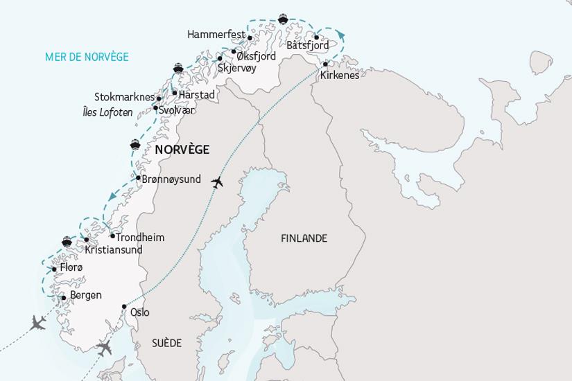 Votre navire : le MS Midnatsol pour les départs de Février et Mars 2026 et le MS Richard With pour les départs à partir de Novembre 2026 (descriptif disponible sur simple demande). À bord des navires de l'Express Côtier, l'accent est mis sur la détente et non sur l'animation comme souvent proposée lors de croisières traditionnelles. L'objectif est de vous amener au plus près d'environnements uniques et de vous faire partager ces expériences avec les autres passagers. Pour information, la plupart des annonces à bord sont effectuées en Anglais et/ou Norvégien. En cas de besoin, votre guide-accompagnateur sera présent pour vous assister et traduire le cas échéant. Les cabines sont relativement petites. Cependant, elles offrent tout le confort nécessaire et chacune d'entre elles dispose de sanitaires privatifs (salle de bain & WC). Les cabines sont généralement équipées de couchettes et certaines d'entre elles peuvent être équipées de couchettes superposées. Tout au long de votre croisière, pour approfondir votre découverte de la Norvège et en complément des excursions déjà incluses dans votre voyage, vous pourrez souscrire des excursions supplémentaires (à réserver et à régler à bord du navire - soumises à disponibilités). Elles sont organisées par le navire avec un guide anglophone (rarement francophone). Elles ont lieu en fonction des conditions climatiques et d'un nombre minimum de participants. Pour le départ de Janvier 2027, vous vivrez la fin de la Nuit Polaire.