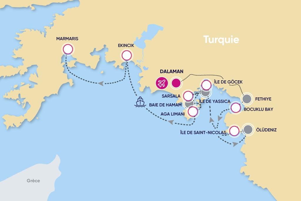 Rendez-vous à l'aéroport pour votre vol à destination de Dalaman. A l'arrivée, vous serez accueilli par notre équipe. Transfert pour Fethiye et installation à bord de votre bateau de croisière. Navigation vers Bocuklu Bay, arrêt baignade. Dîner et nuit à bord.