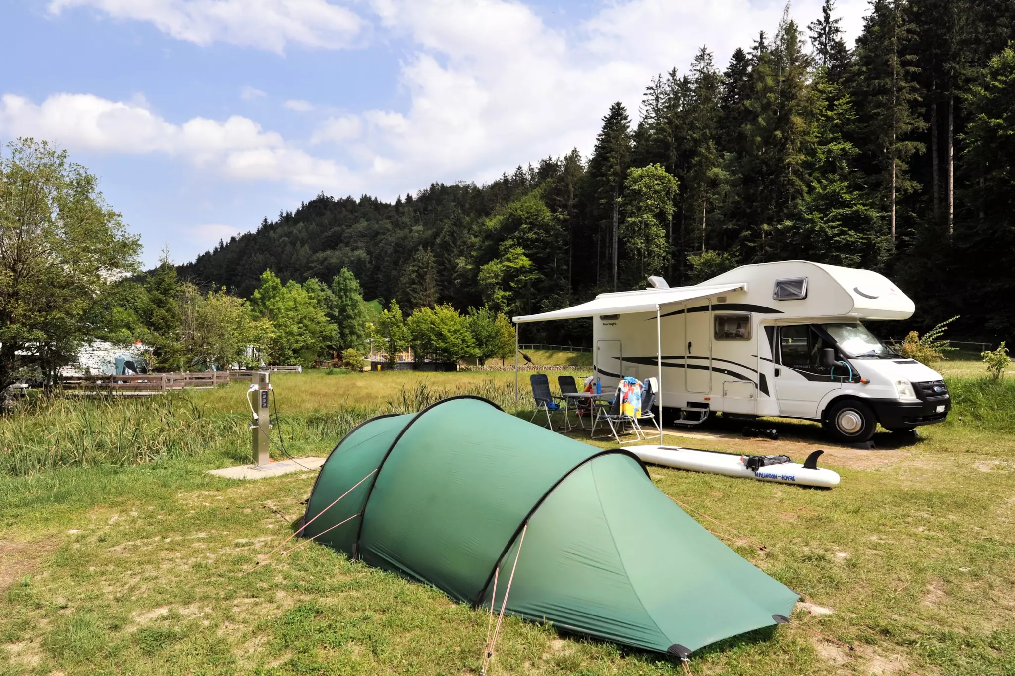 En hiver avec raccordement au gaz, en été avec raccordement d'eau fraîche et d'eaux usées pres de la place. En hiver, l'électricité sera facturée en fonction de la consommation au départ (1,10 € par kWh).