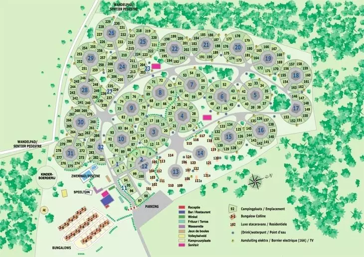 Un magnifique terrain de camping 4 étoiles de presque 10 ha avec énormément de facilités et quelque 250 grands emplacements d'environ 120 m². A côté des traditionnels emplacements pour le tourisme de passage, qui reste la spécialité de ce camping, le campeur peut y retrouver différents types de logements en location comme des caravanes de location, des bungalows, des tentes, des tentes pour groupe, des chalets de randonneurs et des tentes safari.