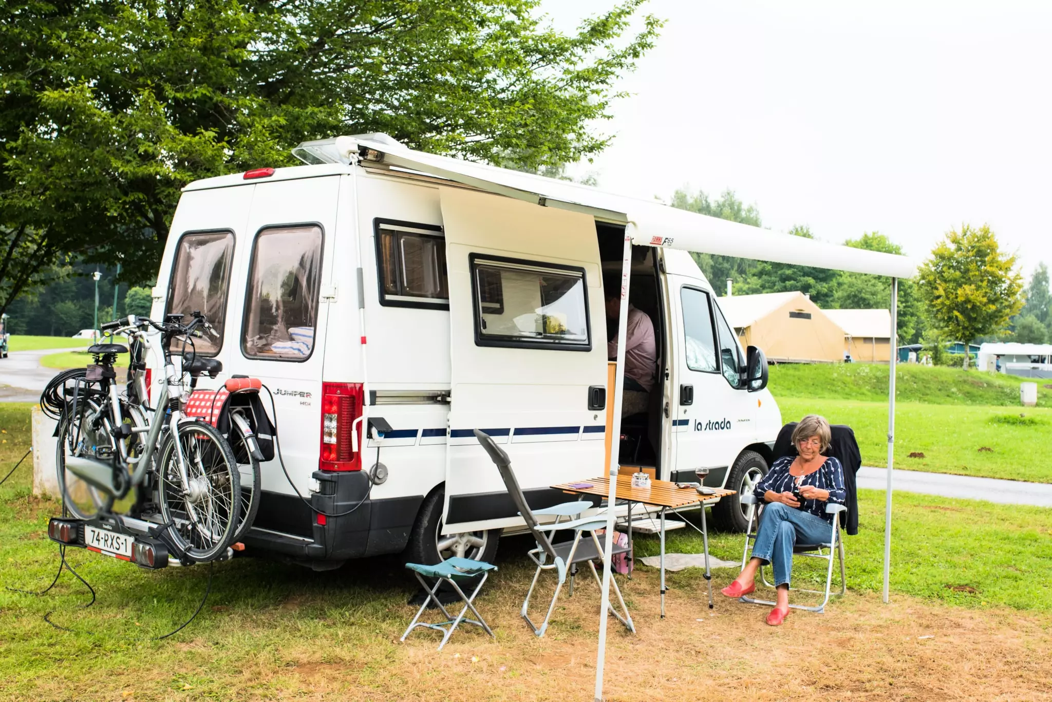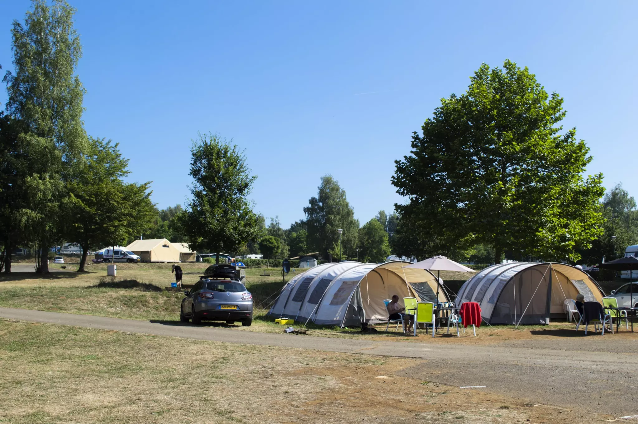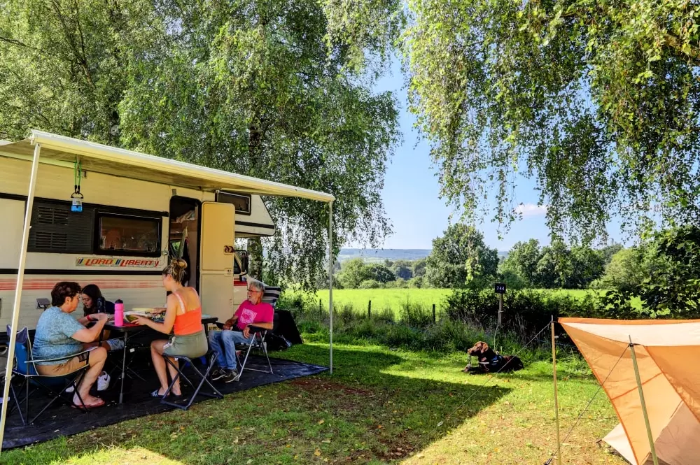 Les emplacements sont libres, pas de haies ou clôture de séparation. Points d'électricité et d'eau disponibles à courte distance.