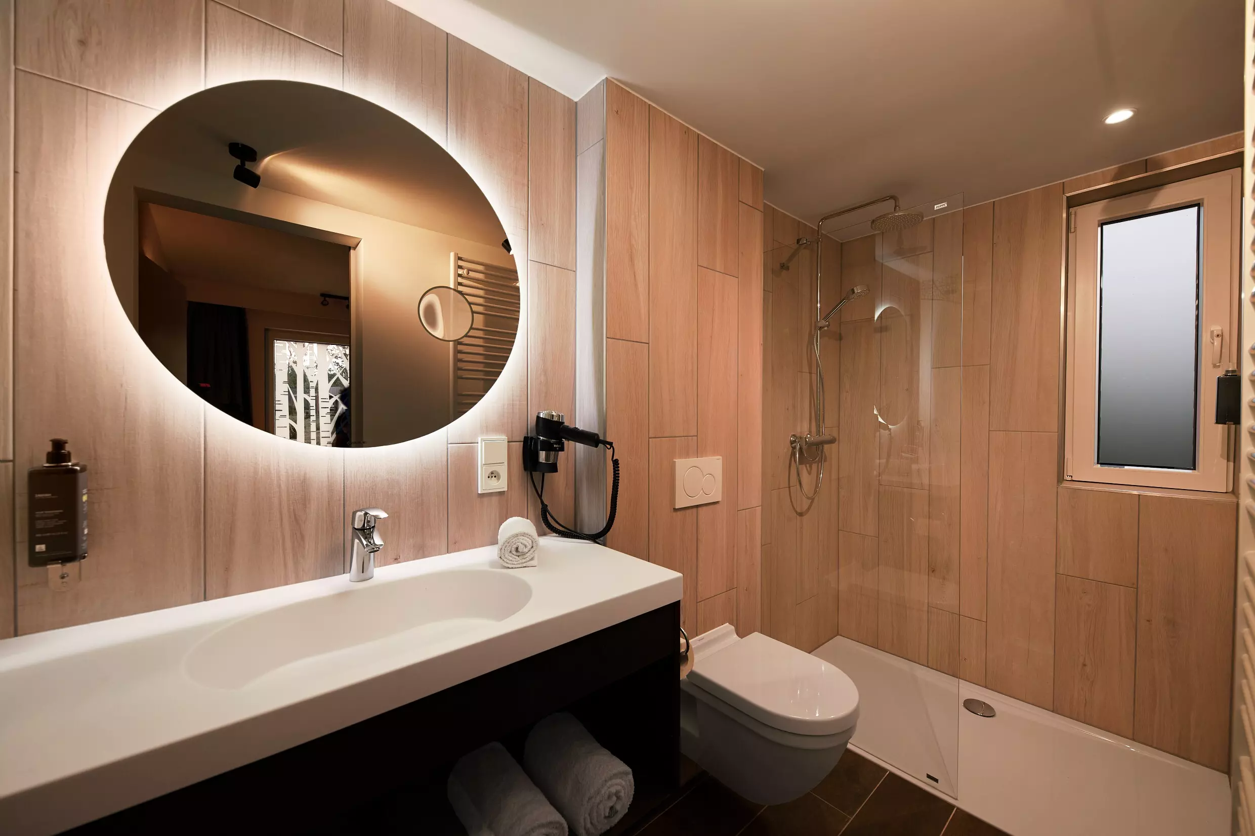 • Chambre avec 2 lits jumeaux et salle de bain attenante avec douche de pluie à l'italienne, WC.