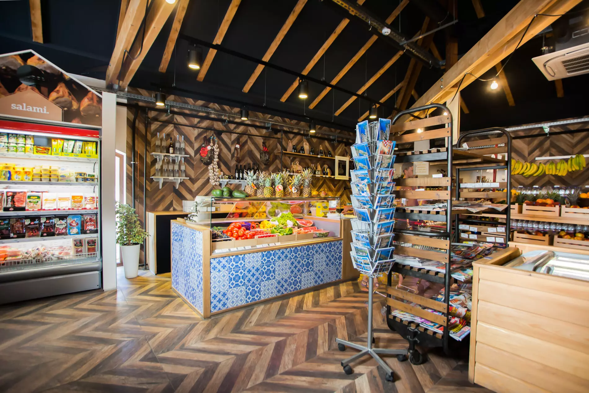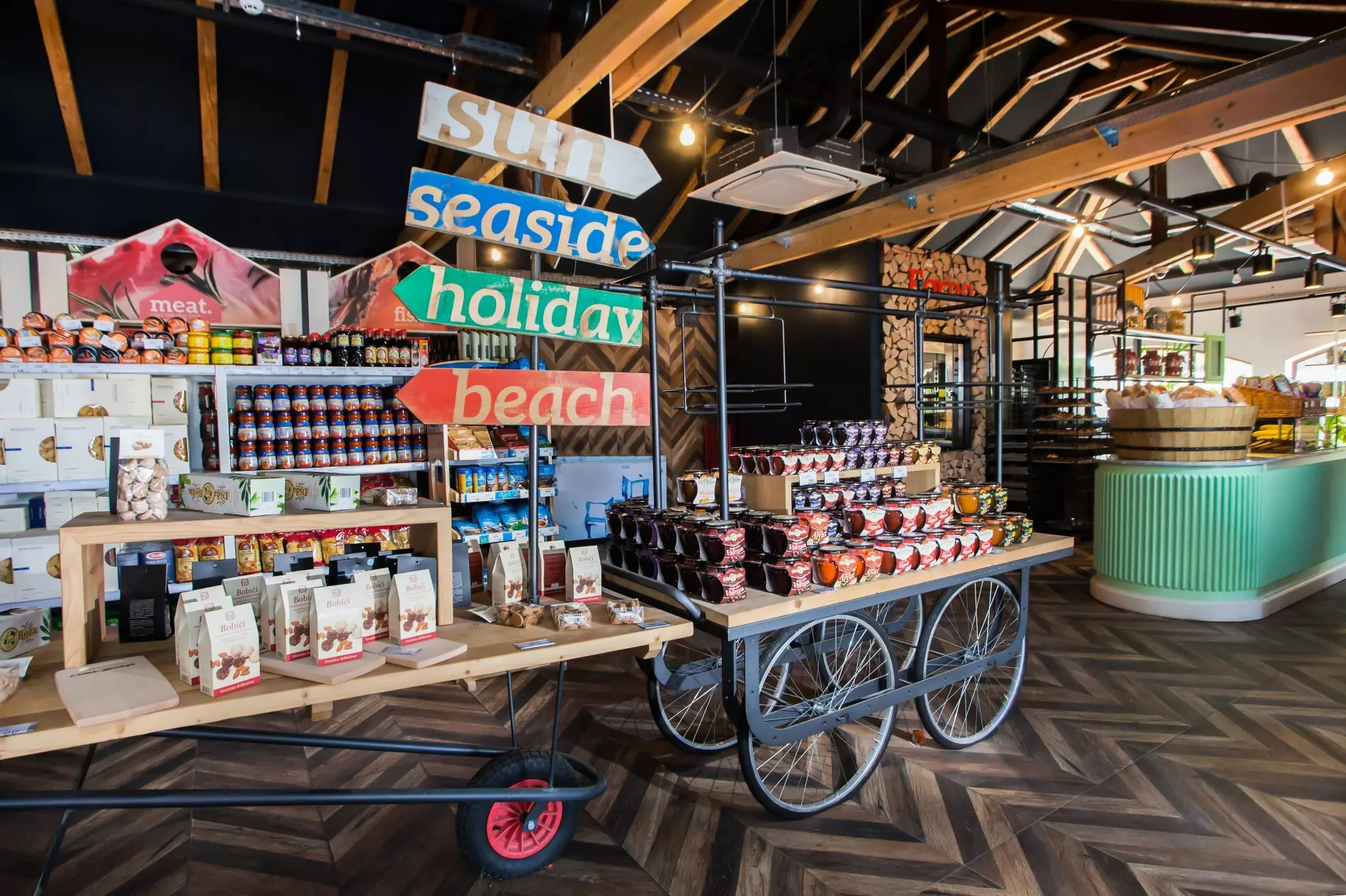 supermarché avec fruits et légumes, une boulangerie et une boutique de souvenirs