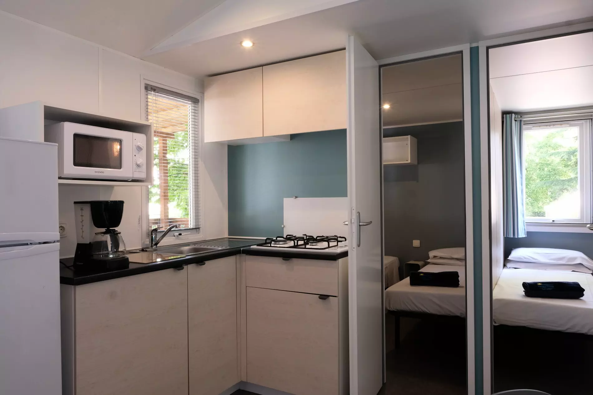 Le mobil home est équipé d'un réfrigérateur, de plaques de cuisson, d'une cafetière et de mobilier de jardin sur la terrasse.