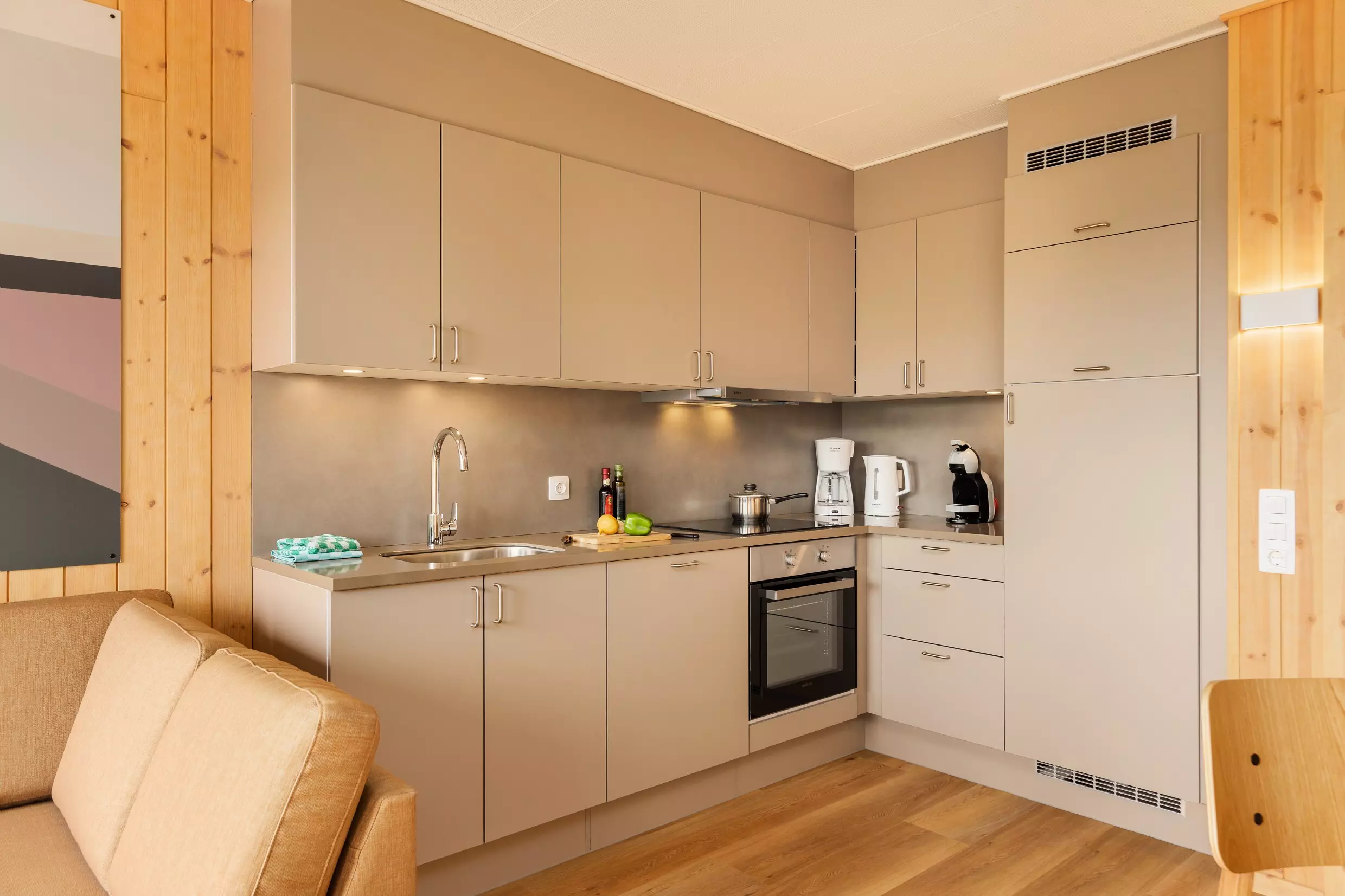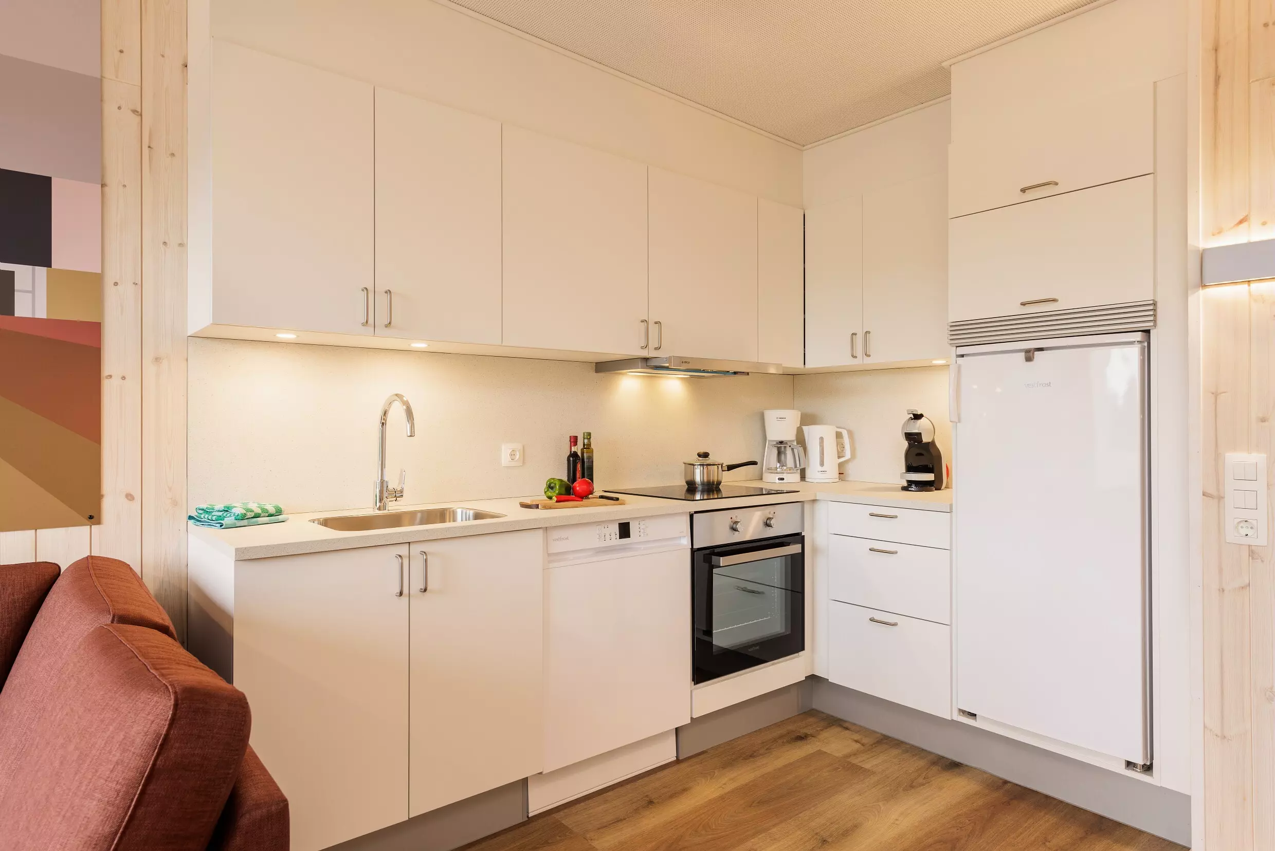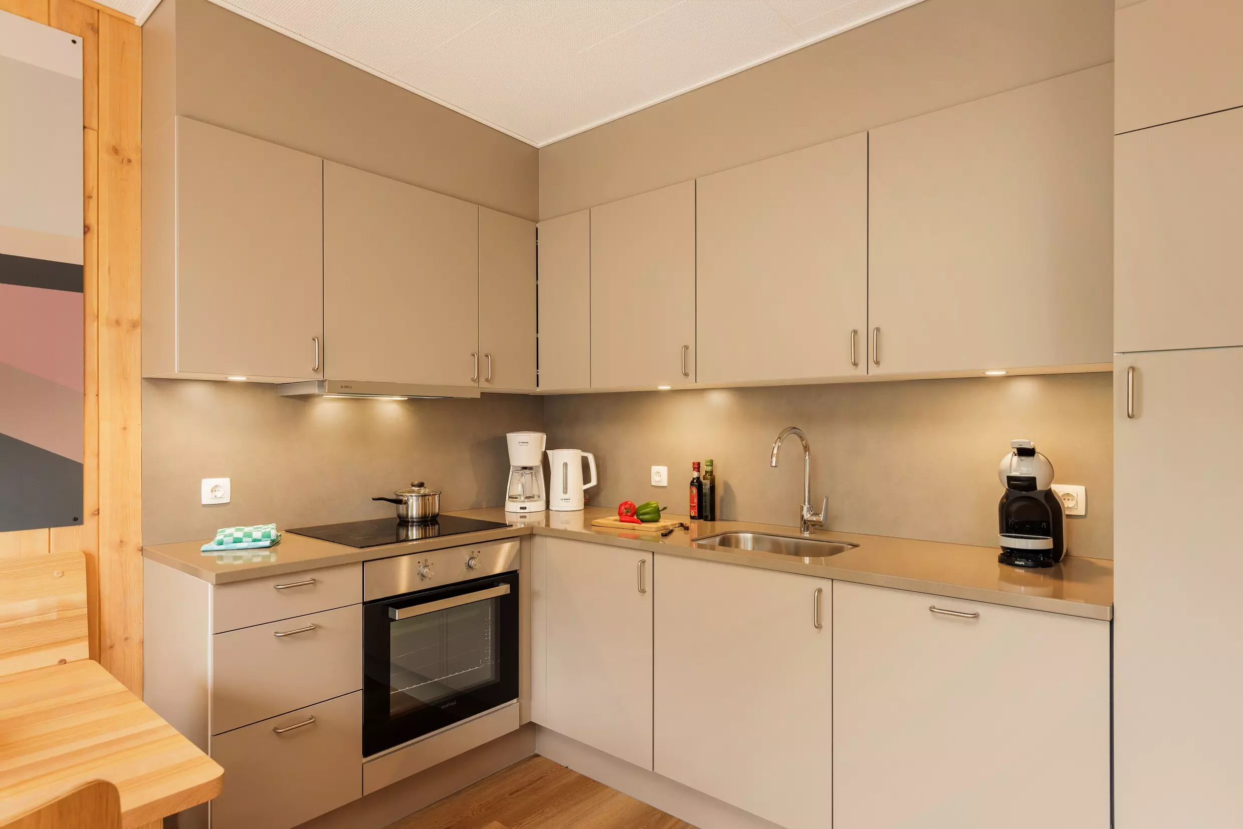 Le cottage est équipé d'une télévision dans le salon, d'un réfrigérateur, de plaques de cuisson, d'un lave-vaisselle, d'un micro-ondes, d'un four, d'un grille-pain, d'une cafetière à filtre et d'une cafetière Nescafé Dolce Gusto, d'un plan de travail réglable en hauteur, du wifi, d'un sauna finlandais et de mobilier de jardin sur la terrasse.