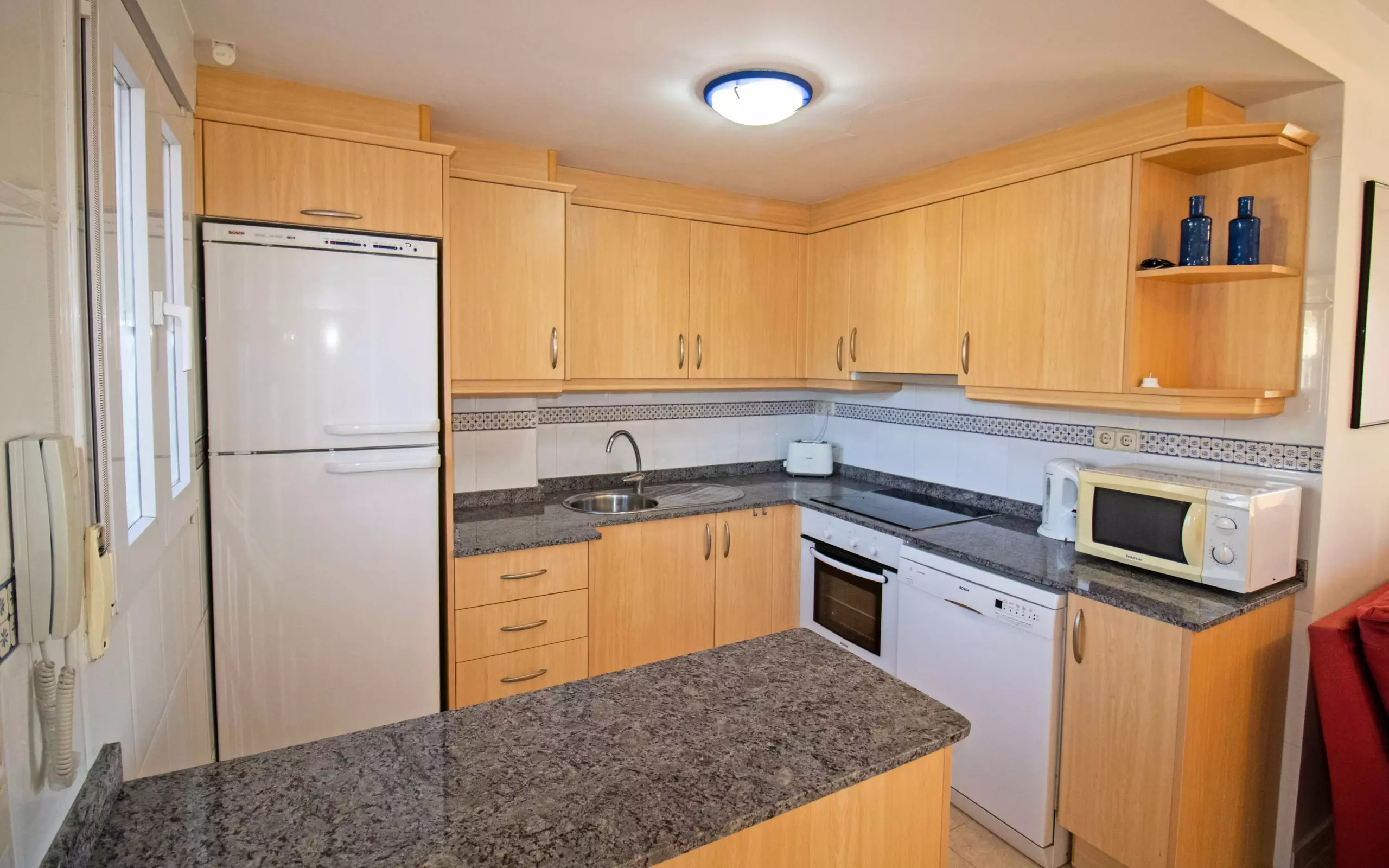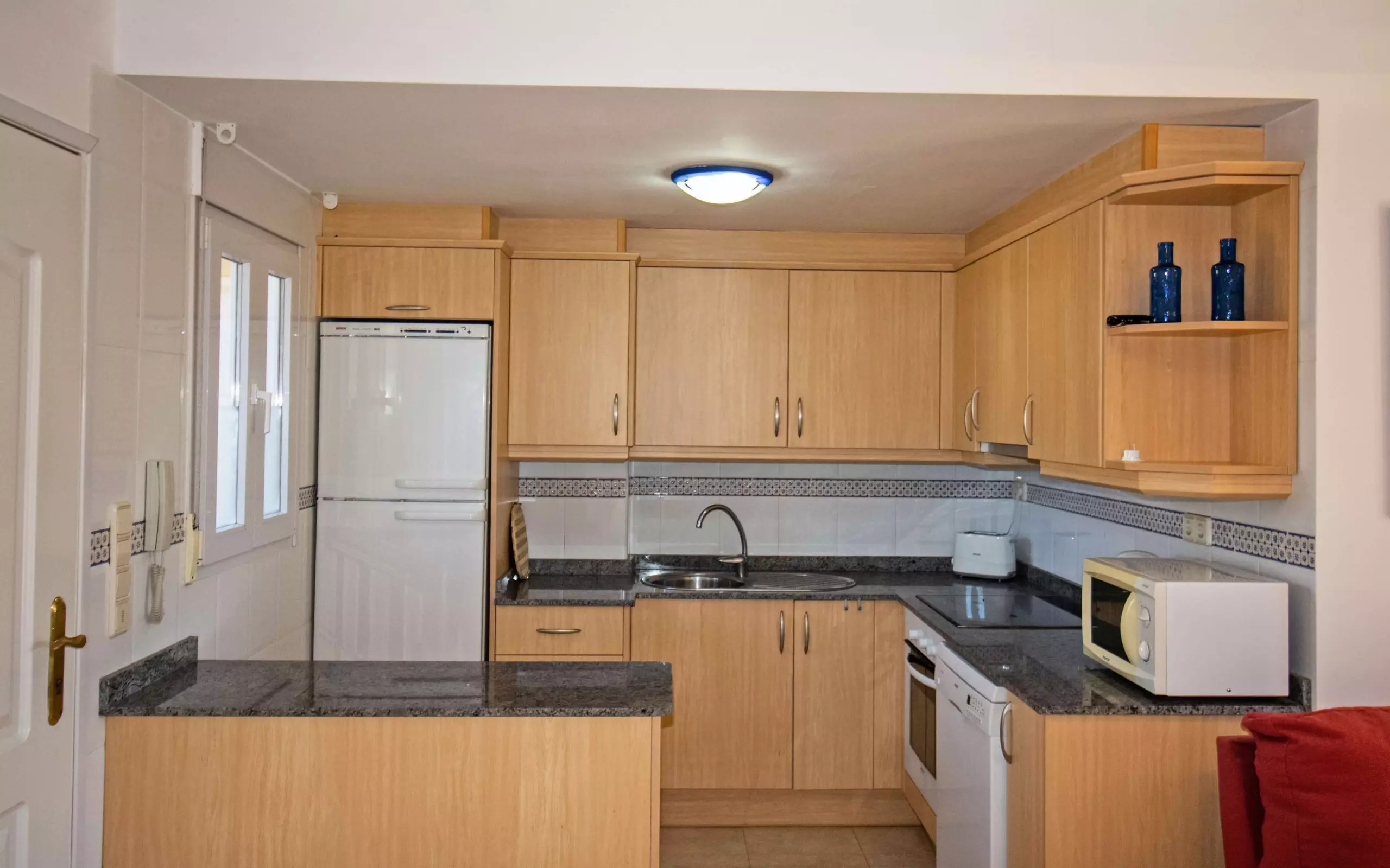 La cuisine américaine, à vitrocéramique, est équipée avec réfrigérateur, micro-ondes, four, congélateur, lave-vaisselle, vaisselle/couverts, cafetière, grille pain et bouilloire.