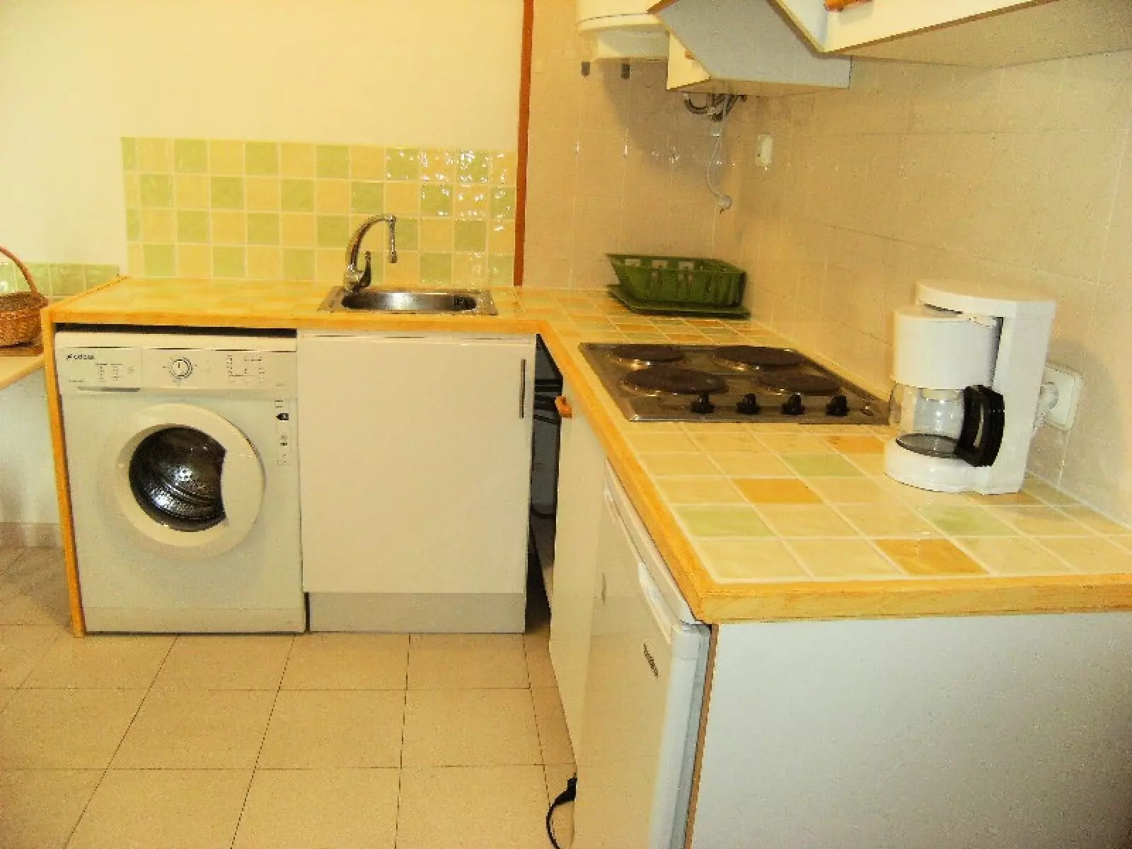 La cuisine américaine, Électrique, est équipée avec réfrigérateur, micro-ondes, lave-linge, vaisselle/couvert, ustensiles/cuisine, cafetière et grille pain.