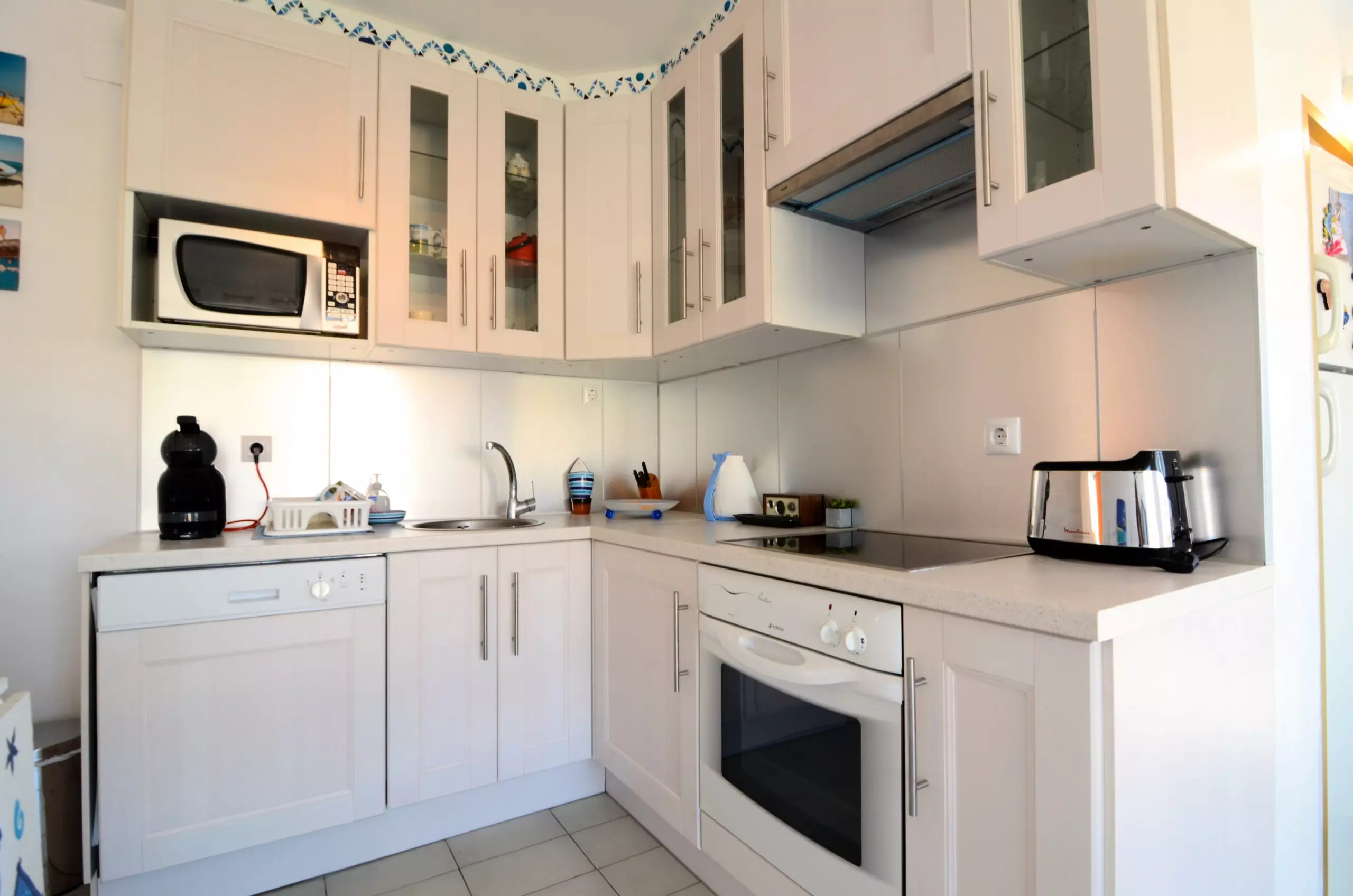 La cuisine américaine, équipée d'une plaque vitrocéramique, dispose de tous les appareils essentiels tels qu'un réfrigérateur, un micro-ondes, un four, un congélateur, une machine à laver, un lave-vaisselle, ainsi que de la vaisselle, des couverts, des ustensiles de cuisine, une cafetière et un grille-pain.