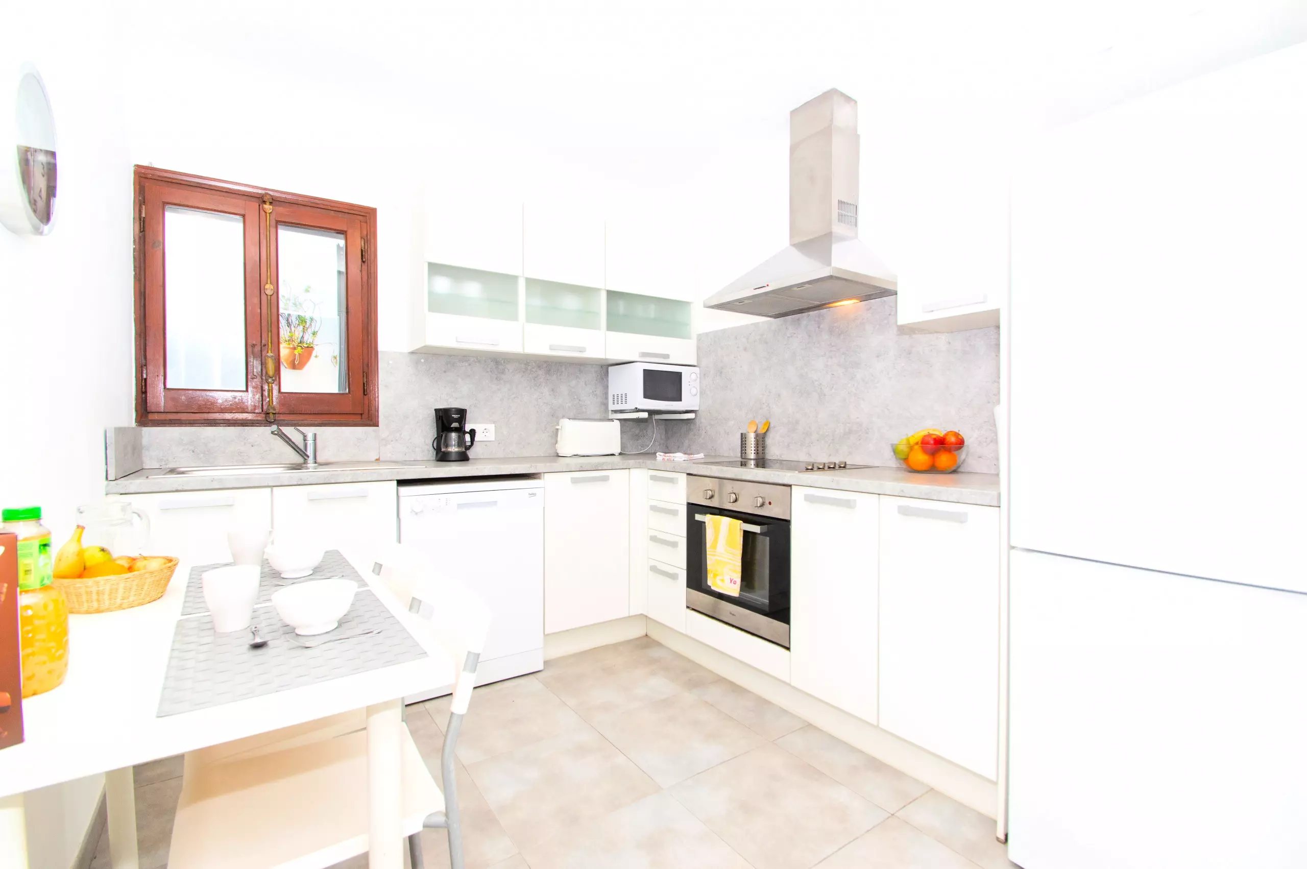 The kitchen is fully equipped with everything you need to satisfy all culinary needs. It has a table for diners, ceramic hob, oven, dishwasher, refrigerator, microwave, coffee maker, toaster, kettle and all kitchen utensils.